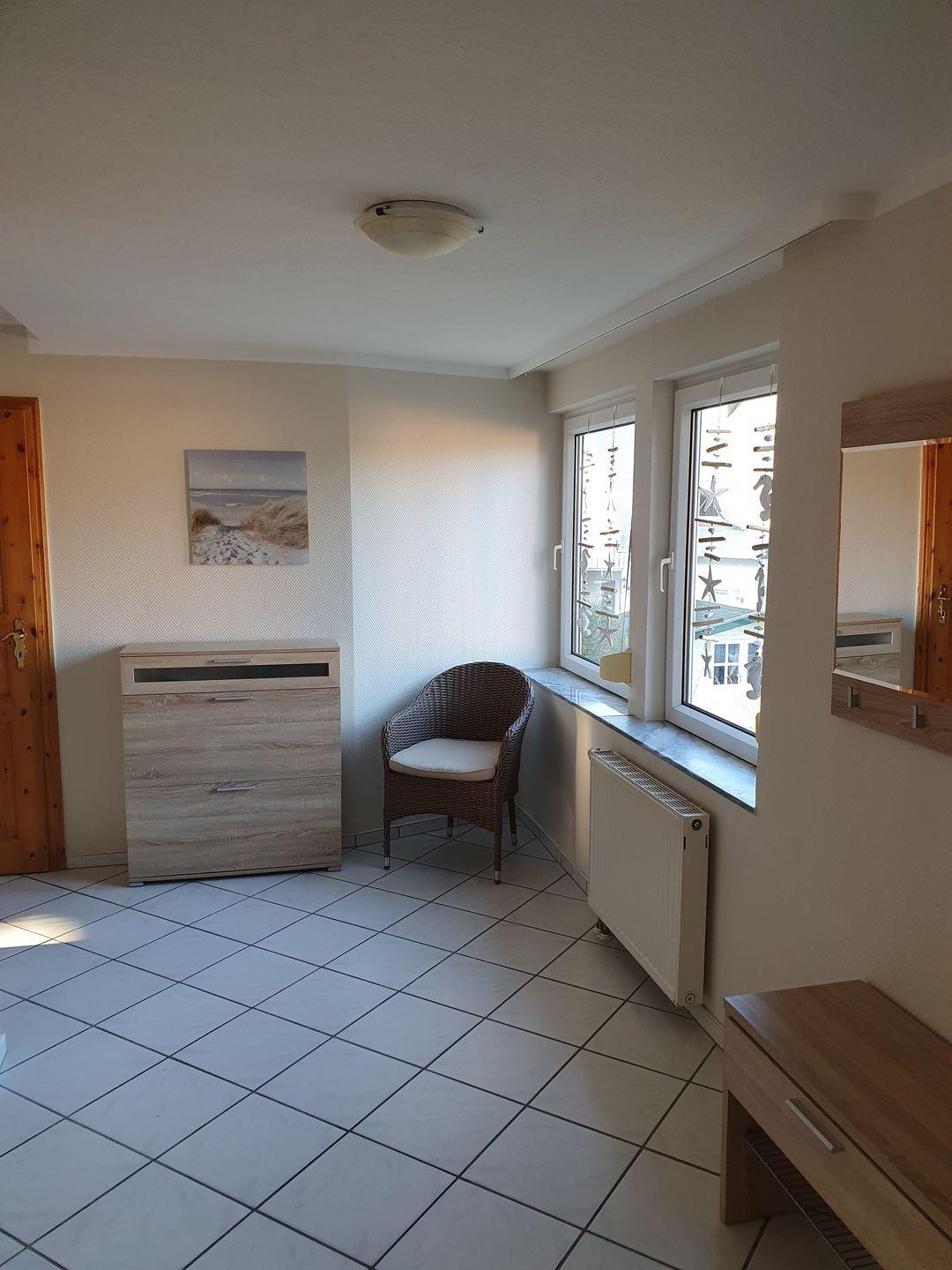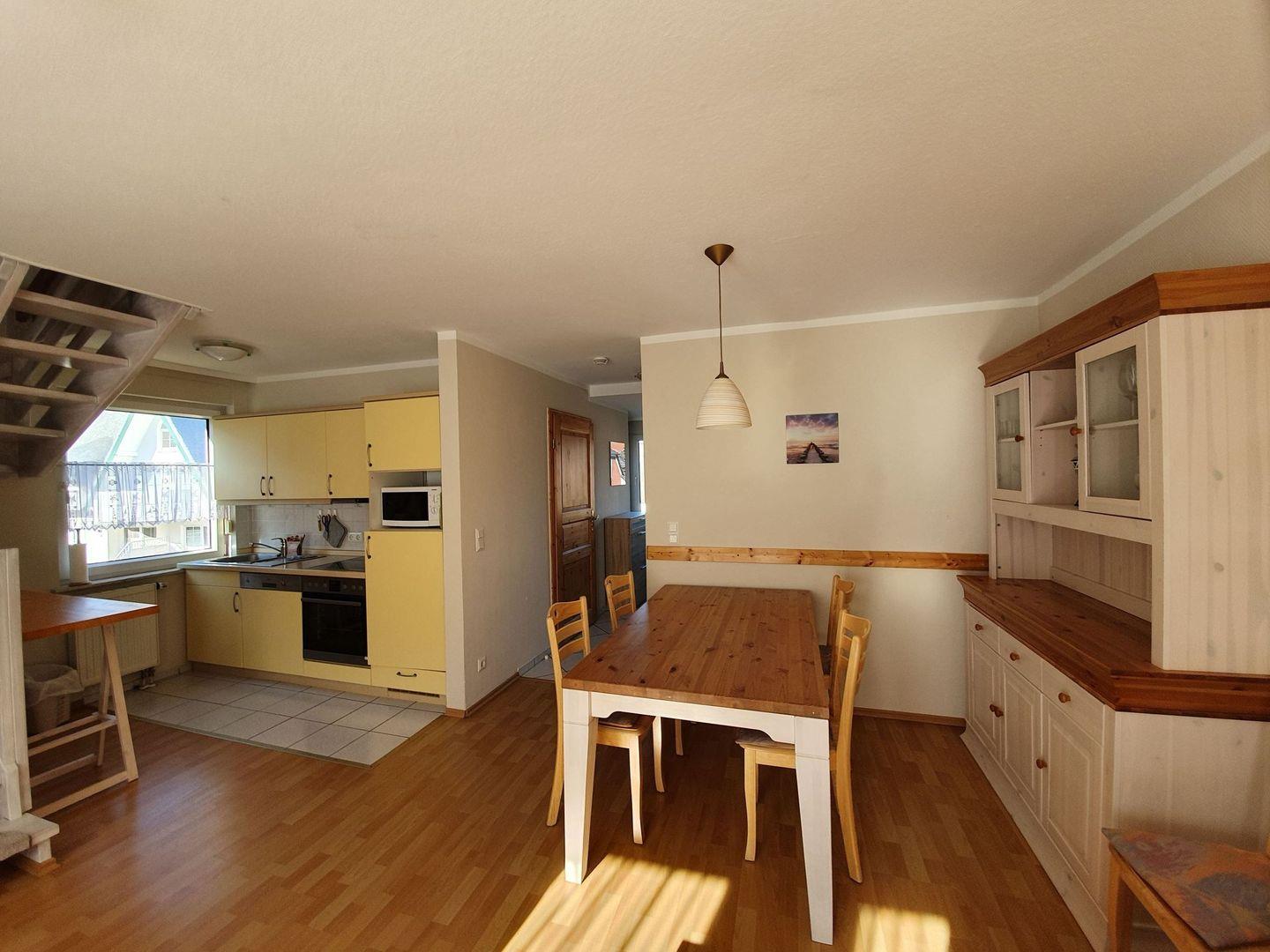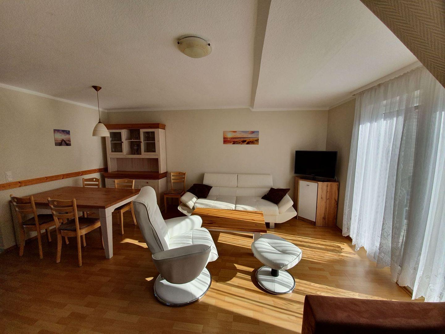 Die 75 m² große Ferienwohnung wird für maximal 4 Erwachsene und 1 Kind vermietet und liegt im 1. Obergeschoß. Über einen Flur gelangt man in das Wohnzimmer mit Schlafcouch für eine Person, integrierter Küche und Essecke, sowie Zugang zum Südbalkon. Auf dieser Etage sind auch eines der Schlafzimmer mit Doppelbett und das Gäste-WC zu finden. Eine Treppe im Wohnbereich führt in das Dachgeschoss, hier sind das zweite Schlafzimmer mit Doppelbett und das Badezimmer mit Badewanne untergebracht.