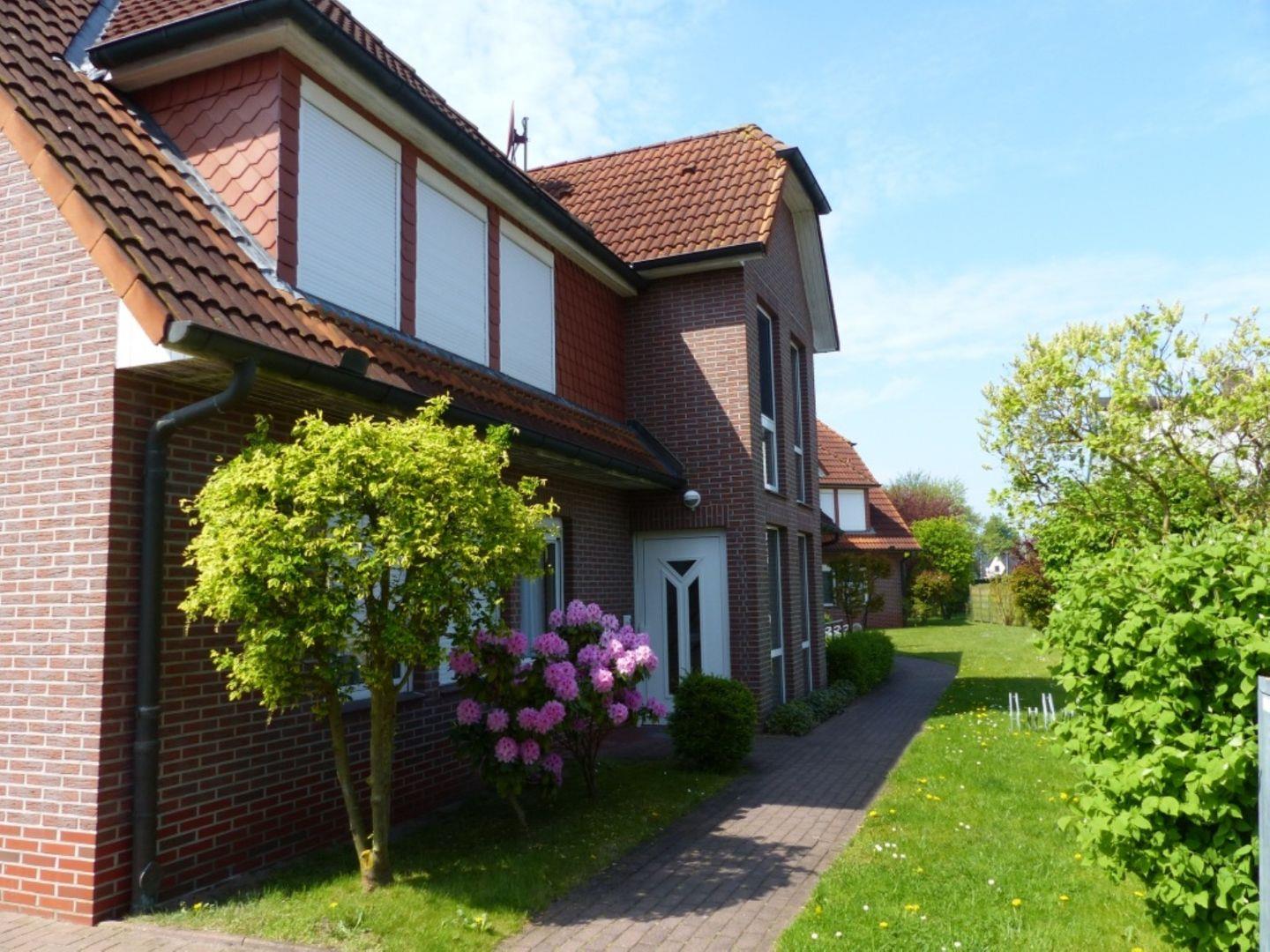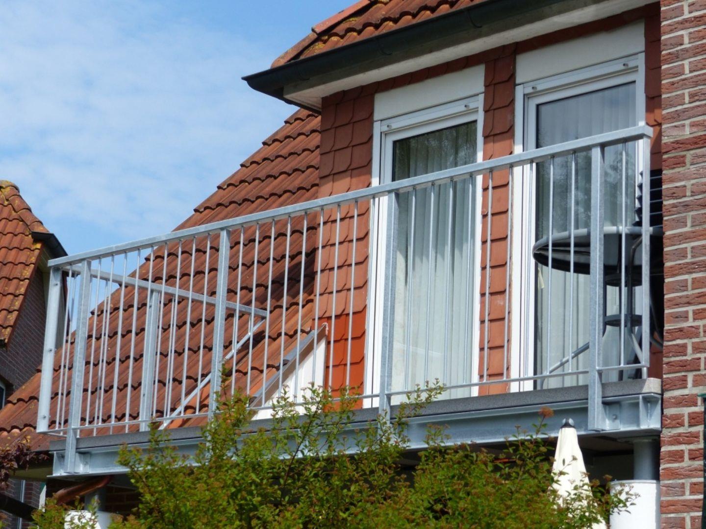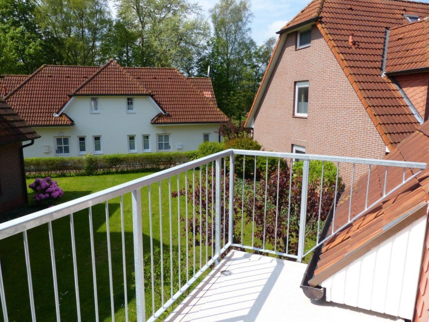 Die 75 m² große Ferienwohnung wird für maximal 4 Erwachsene und 1 Kind vermietet und liegt im 1. Obergeschoß. Über einen Flur gelangt man in das Wohnzimmer mit Schlafcouch für eine Person, integrierter Küche und Essecke, sowie Zugang zum Südbalkon. Auf dieser Etage sind auch eines der Schlafzimmer mit Doppelbett und das Gäste-WC zu finden. Eine Treppe im Wohnbereich führt in das Dachgeschoss, hier sind das zweite Schlafzimmer mit Doppelbett und das Badezimmer mit Badewanne untergebracht.
