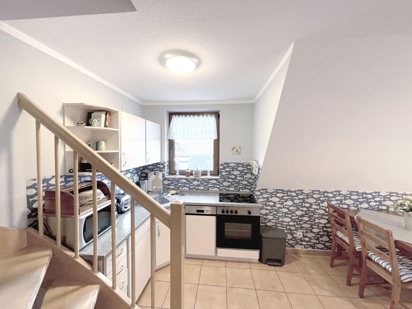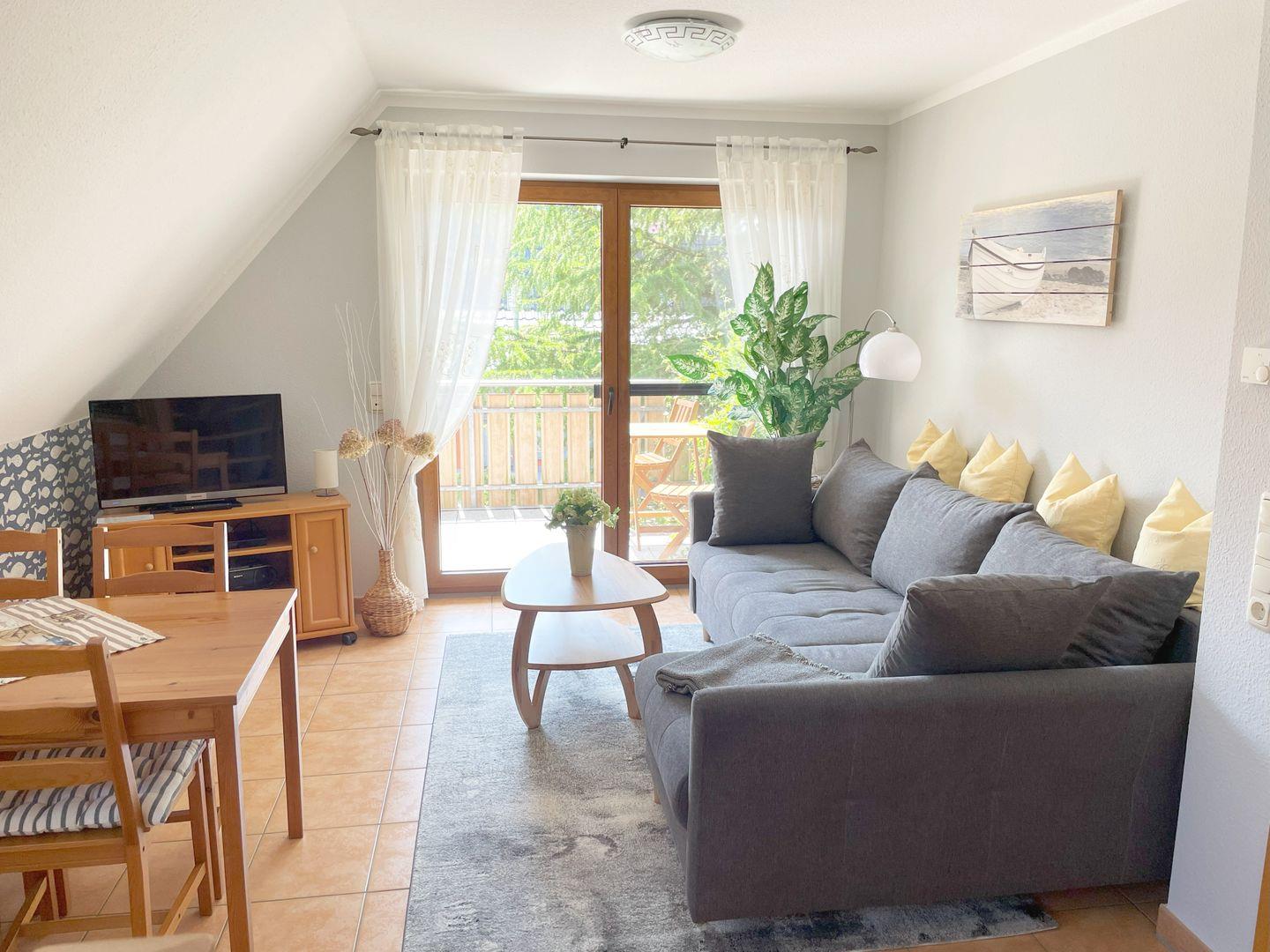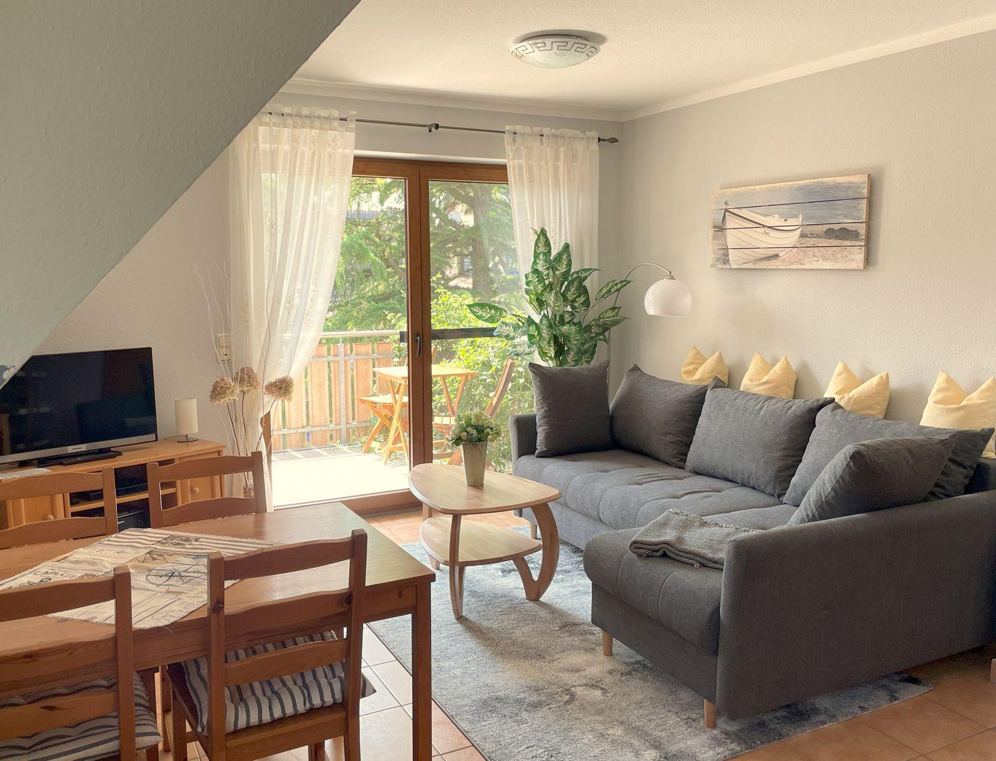 Die 50 m² große Maisonettewohnung wird bevorzugt an 2 Erwachsene und 2 Kinder vermietet. Der Wohnraum mit integrierter Küche und Essecke hat einen direkten Zugang zum Südbalkon. Das Bad mit Dusche und WC befindet sich auf der Wohnebene ebenso wie das Elternschlafzimmer mit Ehebett. Das 2. Schlafzimmer ist mit 2 Einzelbetten ausgestattet und liegt im Dachgeschoss. Die bezogenen Betten sowie das Wäschepaket sind in diesem Objekt inklusive. Ein kleiner Elektrogrill für den Balkon und ein Interzugang über W-LAN ergänzen die Ausstattung.