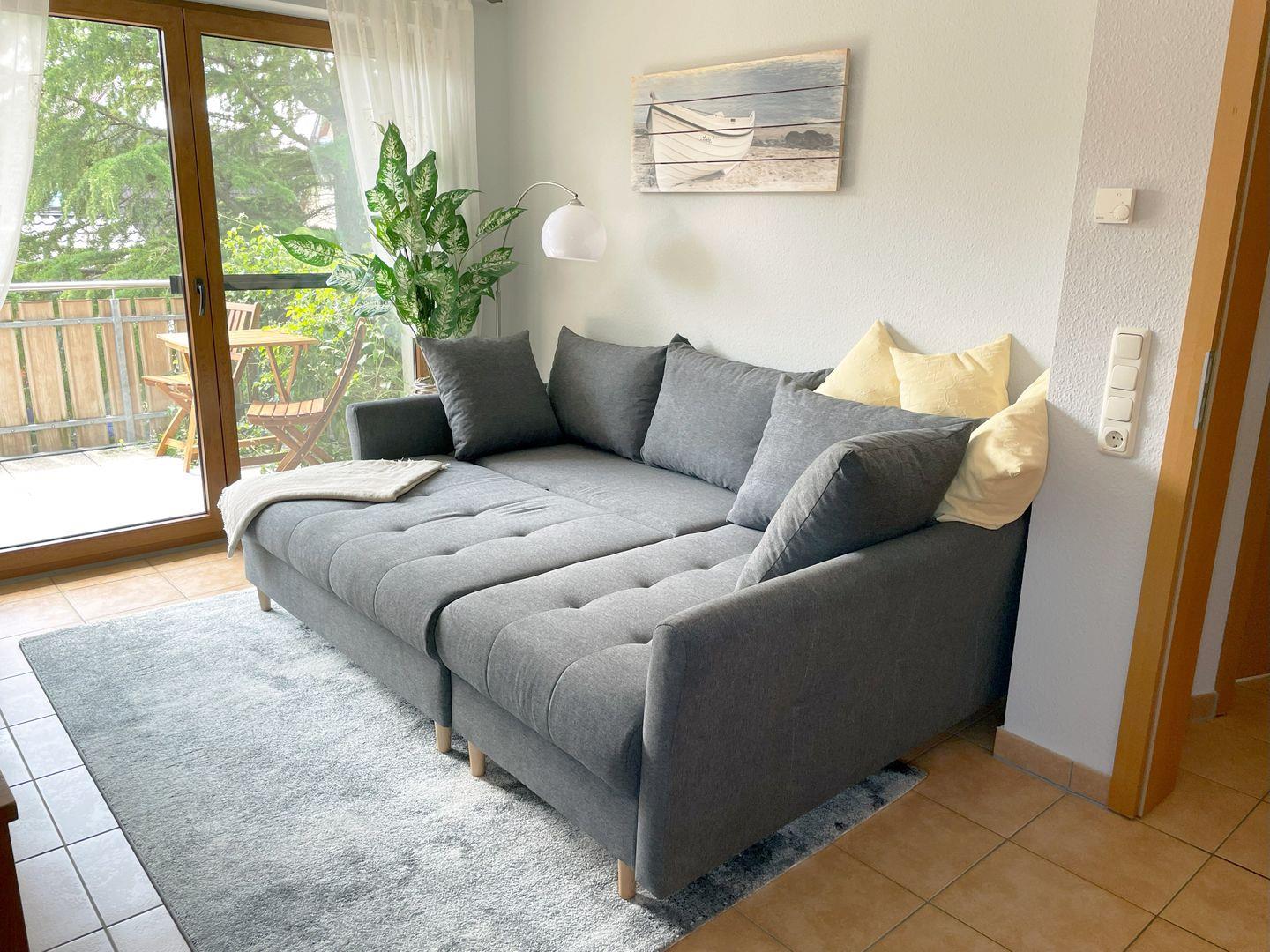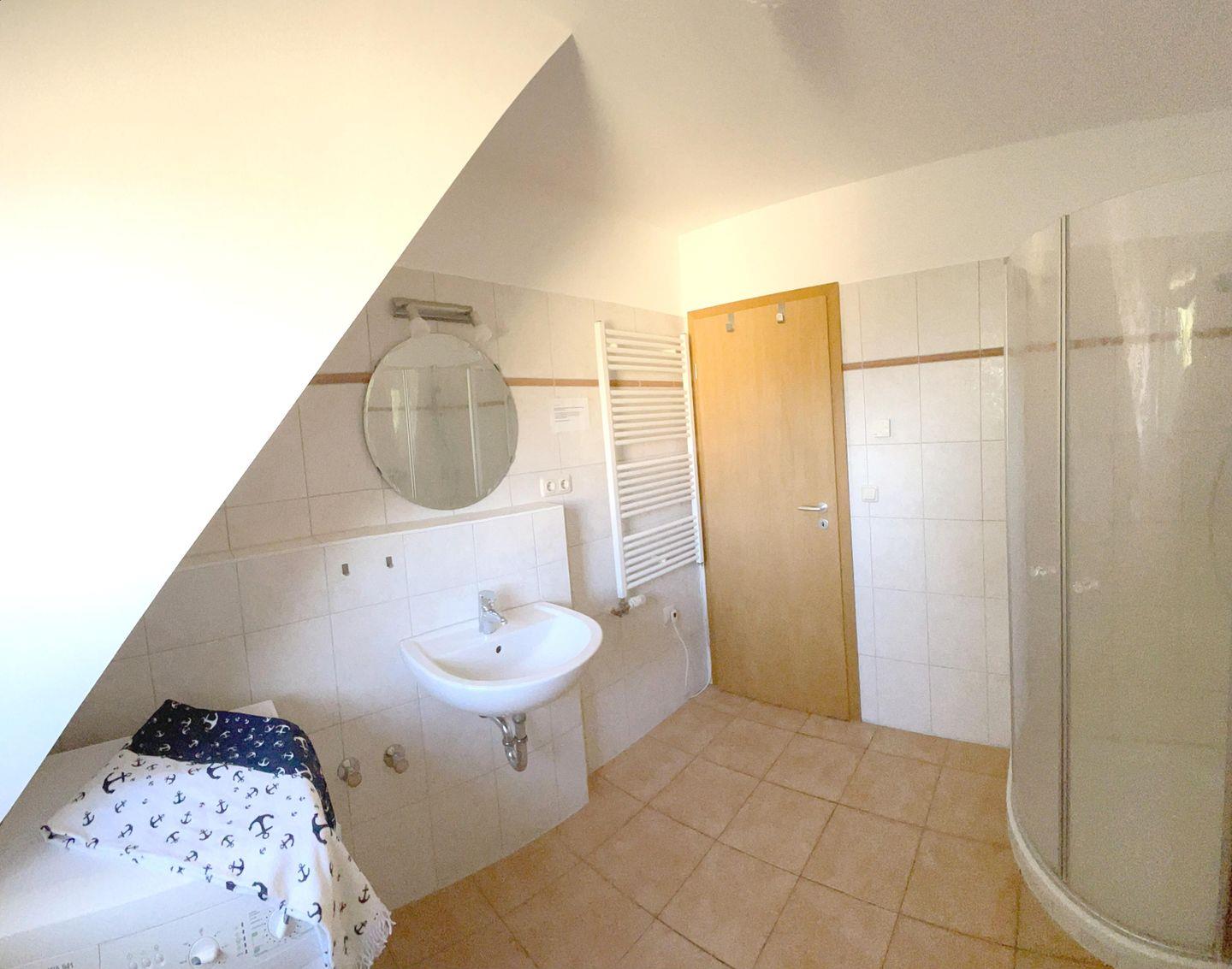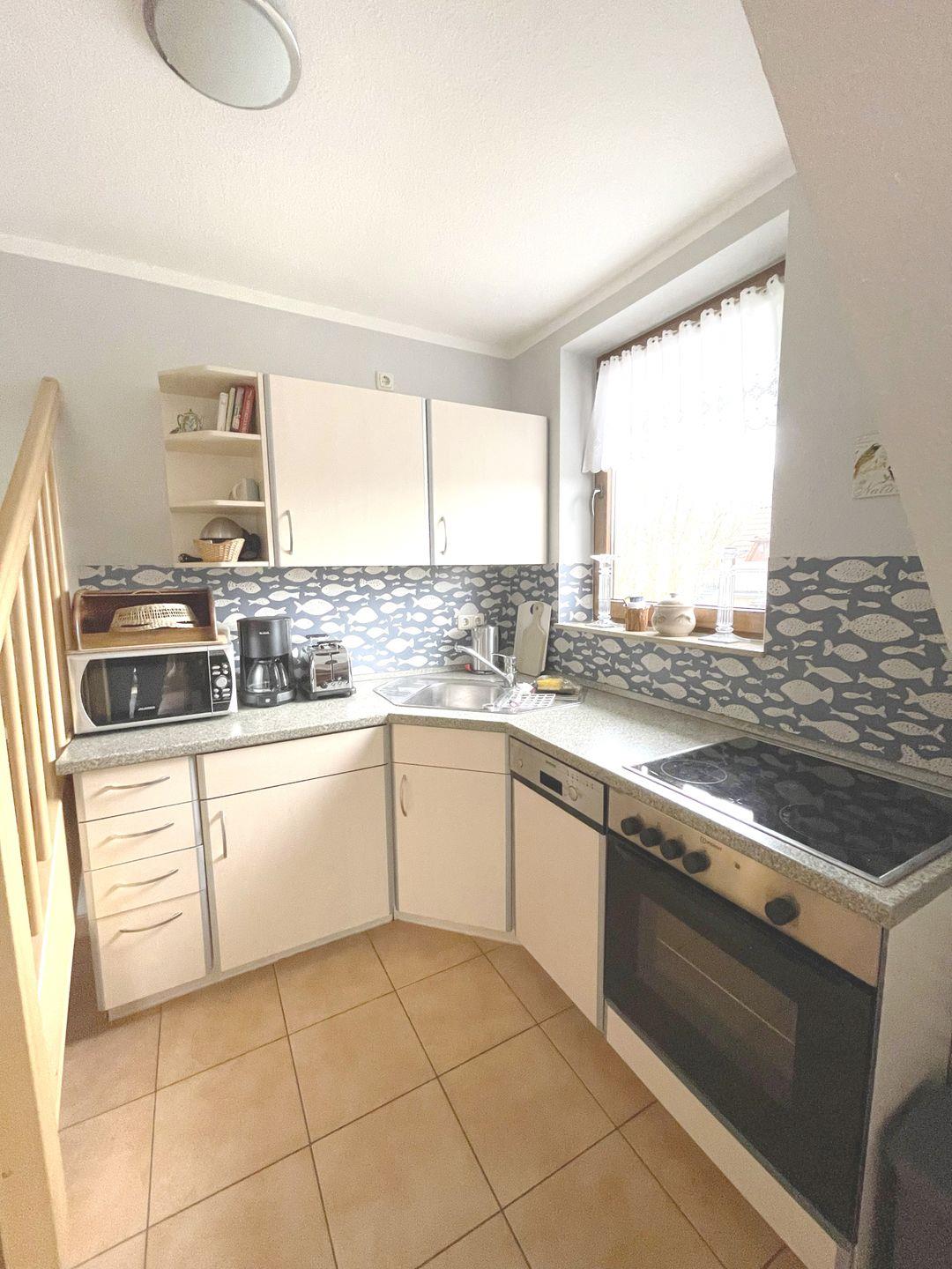 Die 50 m² große Maisonettewohnung wird bevorzugt an 2 Erwachsene und 2 Kinder vermietet. Der Wohnraum mit integrierter Küche und Essecke hat einen direkten Zugang zum Südbalkon. Das Bad mit Dusche und WC befindet sich auf der Wohnebene ebenso wie das Elternschlafzimmer mit Ehebett. Das 2. Schlafzimmer ist mit 2 Einzelbetten ausgestattet und liegt im Dachgeschoss. Die bezogenen Betten sowie das Wäschepaket sind in diesem Objekt inklusive. Ein kleiner Elektrogrill für den Balkon und ein Interzugang über W-LAN ergänzen die Ausstattung.