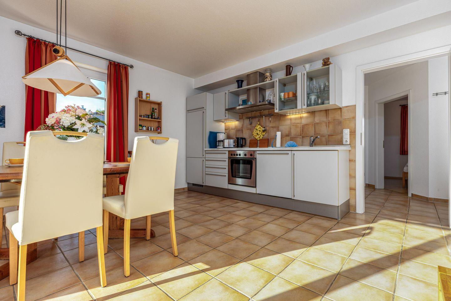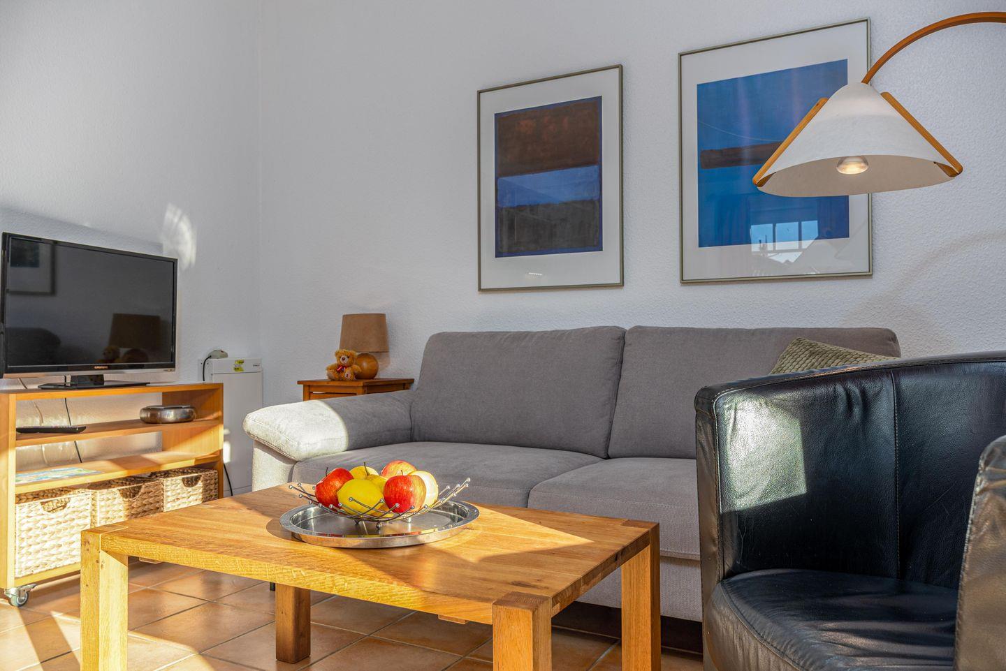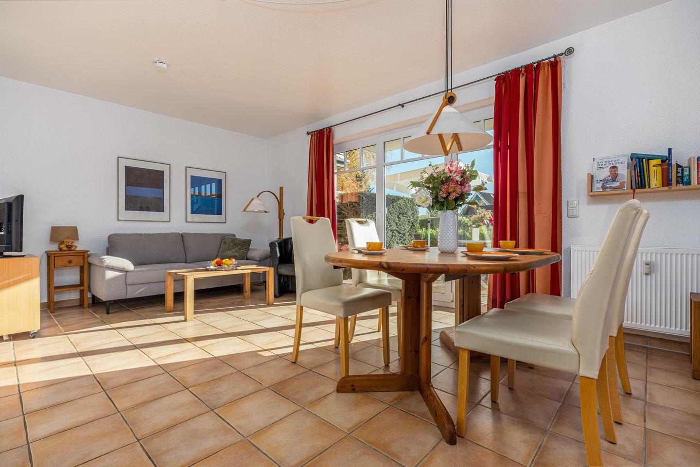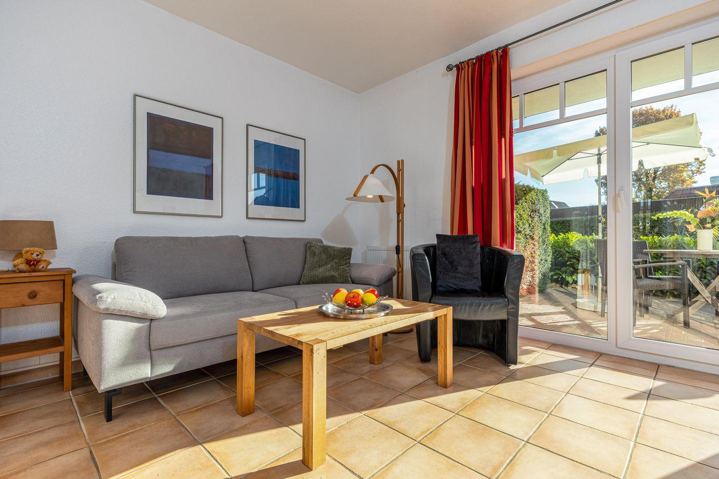 Die 59 qm große Erdgeschosswohnung wird für bis zu 2 Erwachsene + 2 Kinder angeboten. In den großen Wohnraum sind die Essecke und die große Küchenzeile integriert. Von hier erreichen Sie die beiden Terrassen, die nach Süden bzw. nach Westen ausgerichtet sind. Eines der Schlafzimmer ist mit einem Doppelbett eingerichtet, das andere mit zwei einzelnen Betten. Im Badezimmer befinden sich eine Badewanne und das WC. Außenrollos und Fliegengitter in allen Zimmern und ein Fahrradschuppen komplettieren die Ausstattung.