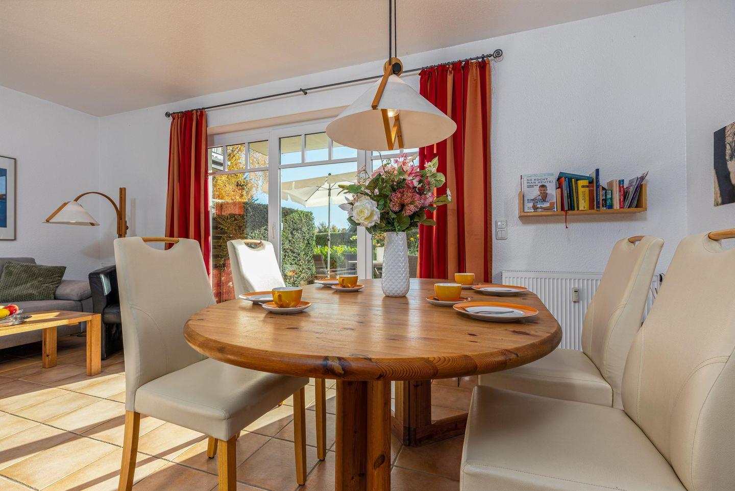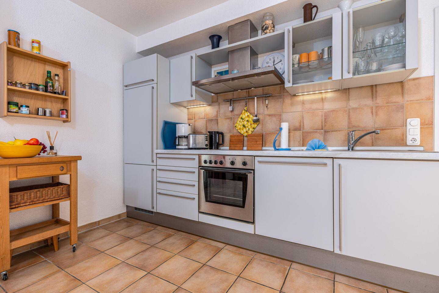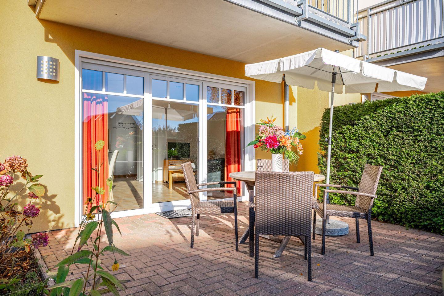 Die 59 qm große Erdgeschosswohnung wird für bis zu 2 Erwachsene + 2 Kinder angeboten. In den großen Wohnraum sind die Essecke und die große Küchenzeile integriert. Von hier erreichen Sie die beiden Terrassen, die nach Süden bzw. nach Westen ausgerichtet sind. Eines der Schlafzimmer ist mit einem Doppelbett eingerichtet, das andere mit zwei einzelnen Betten. Im Badezimmer befinden sich eine Badewanne und das WC. Außenrollos und Fliegengitter in allen Zimmern und ein Fahrradschuppen komplettieren die Ausstattung.