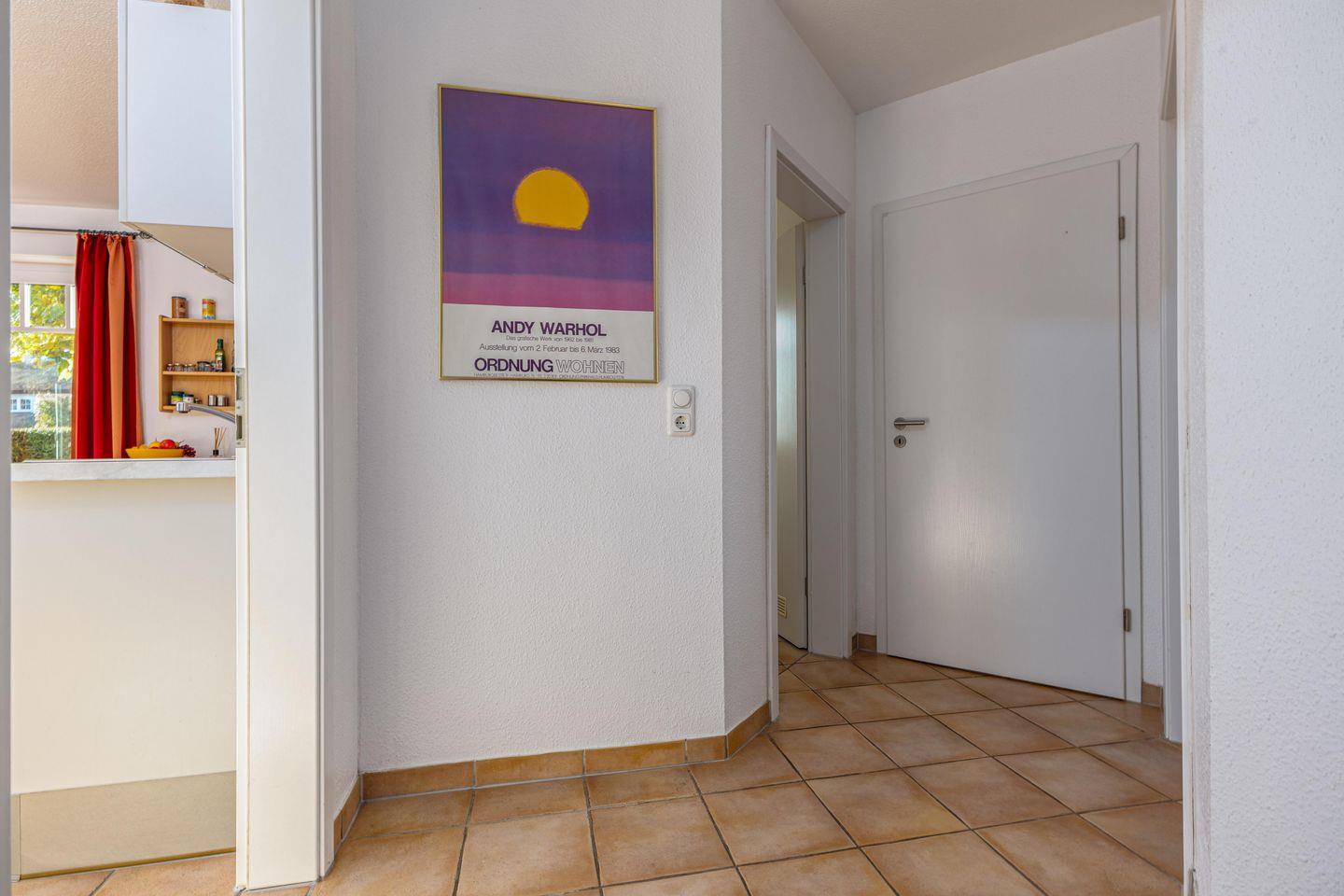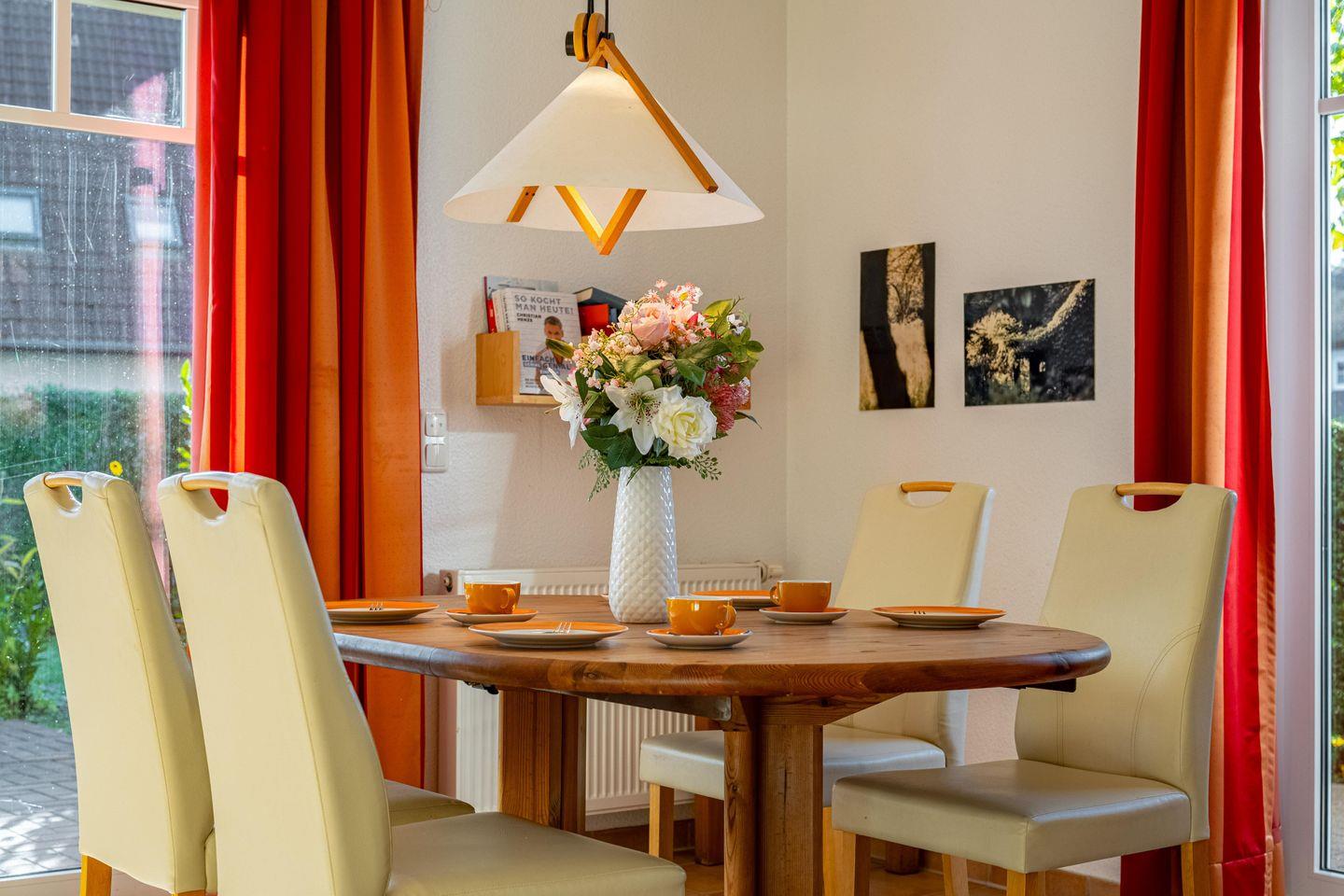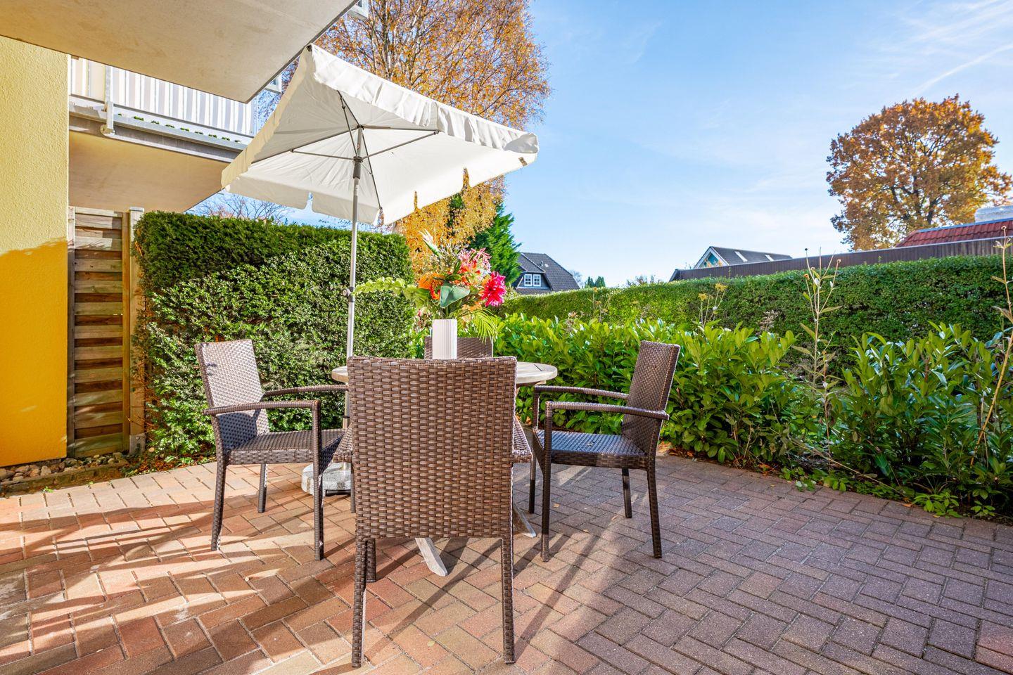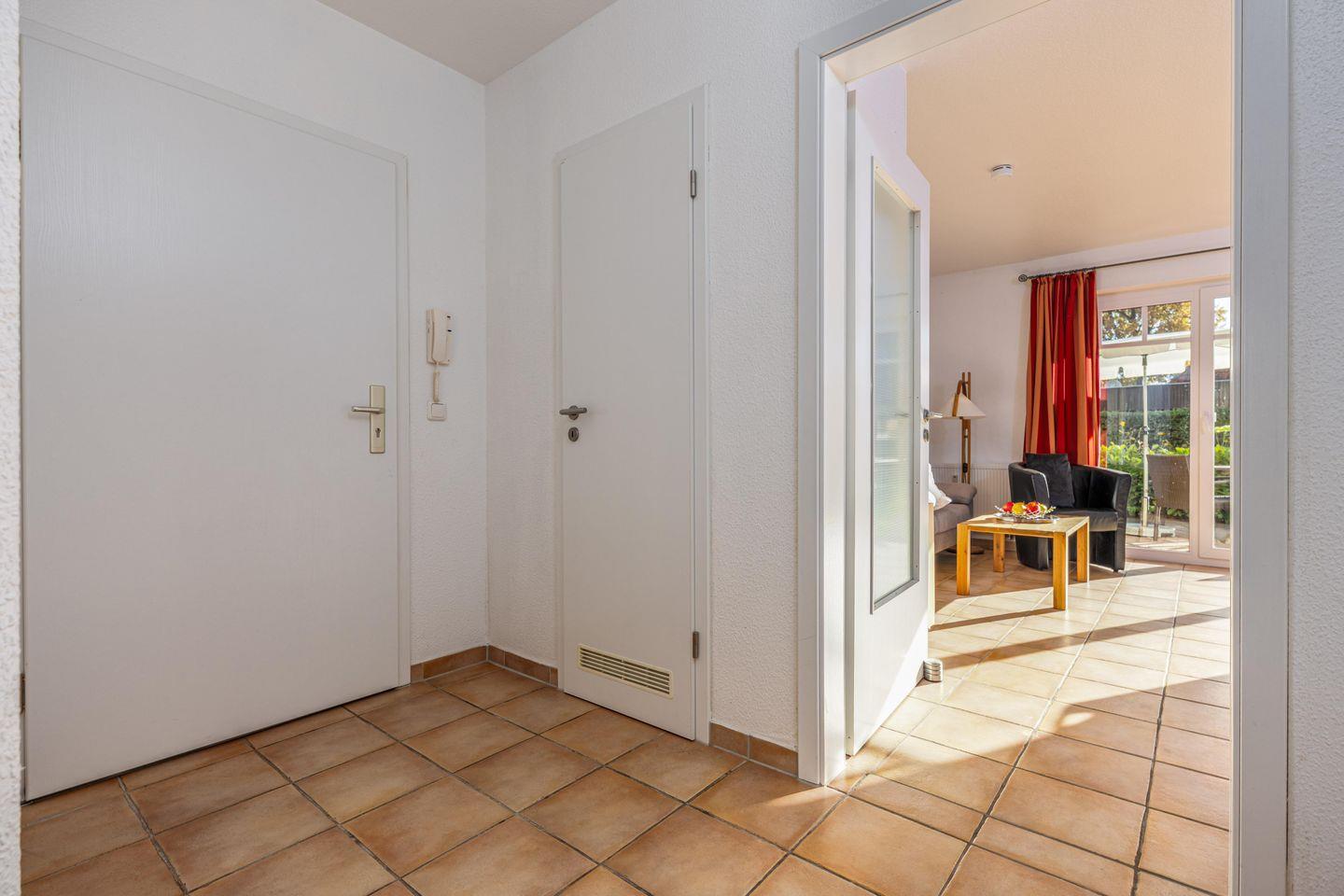 Die 59 qm große Erdgeschosswohnung wird für bis zu 2 Erwachsene + 2 Kinder angeboten. In den großen Wohnraum sind die Essecke und die große Küchenzeile integriert. Von hier erreichen Sie die beiden Terrassen, die nach Süden bzw. nach Westen ausgerichtet sind. Eines der Schlafzimmer ist mit einem Doppelbett eingerichtet, das andere mit zwei einzelnen Betten. Im Badezimmer befinden sich eine Badewanne und das WC. Außenrollos und Fliegengitter in allen Zimmern und ein Fahrradschuppen komplettieren die Ausstattung.