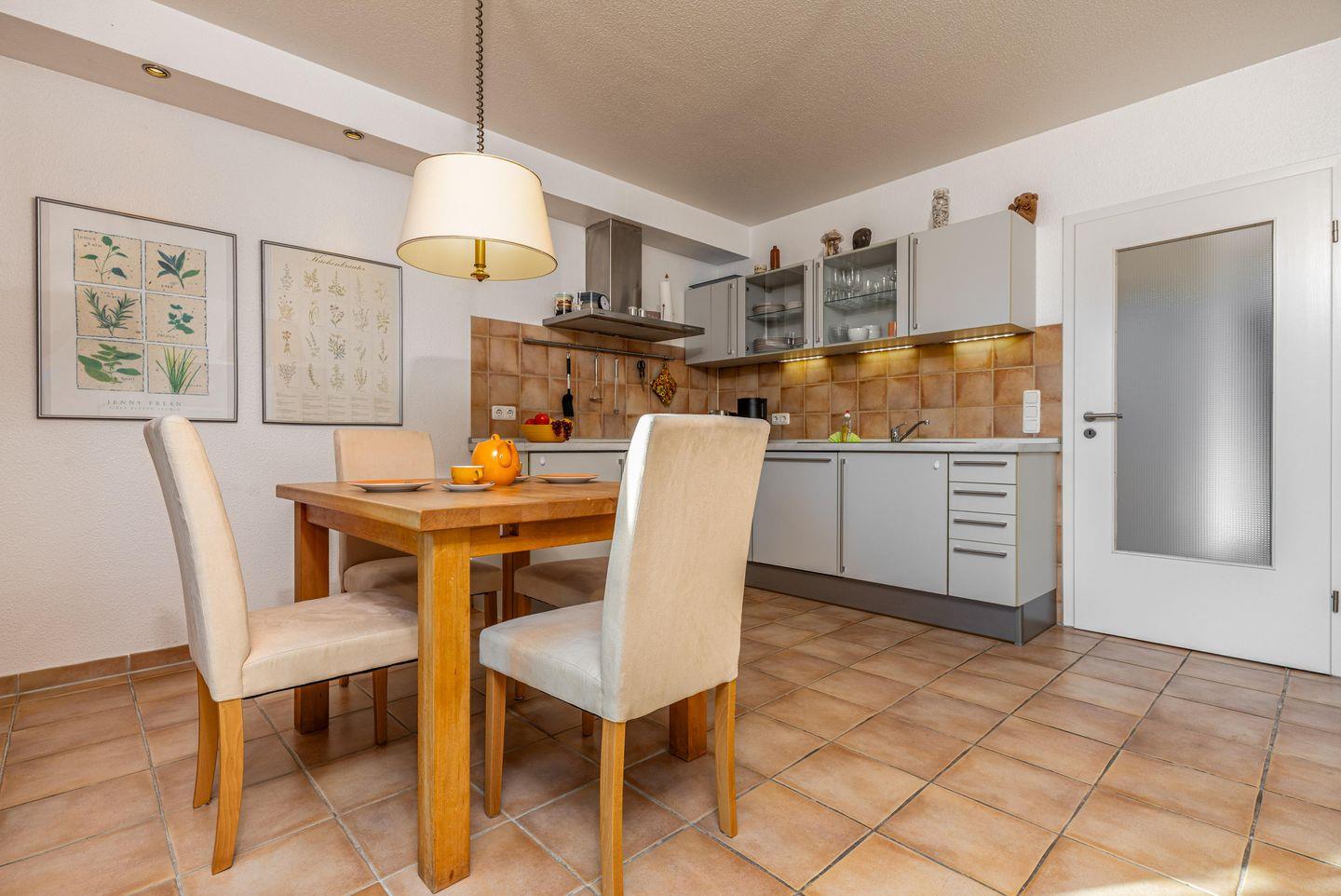 Die 50 qm große Erdgeschosswohnung wird für bis zu 2 Erwachsene und 2 Kinder vermietet. In das Wohnzimmer mit Essecke ist die Küchenzeile integriert, von hier gelangt man auch auf die Südterrasse. Das Schlafzimmer ist mit einem Doppelbett ausgestattet, auf dem Schlafsofa im Wohnbereich können bis zu zwei weitere Personen aufgebettet werden. Das Badezimmer ist mit Dusche und WC versehen. Ein Fahrradschuppen und Aussenrollos ergänzen die Ausstattung.