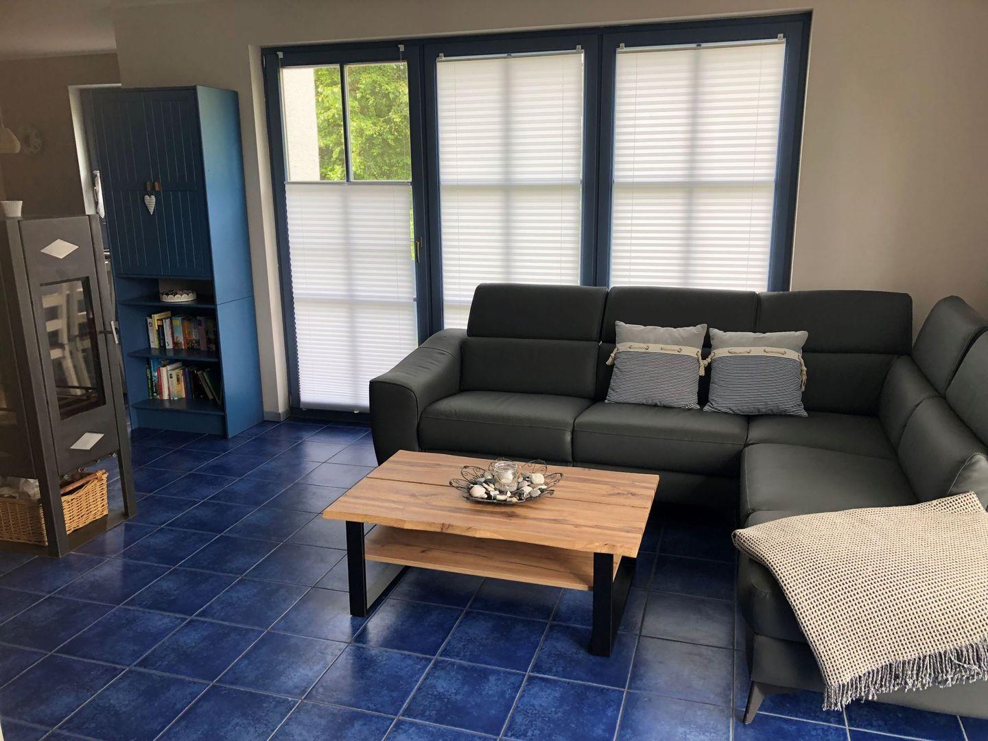 Die 110 qm große Doppelhaushälfte kann mit bis zu 6 Erwachsene oder 4 Erwachsenen und 3 Kindern + 1 Kleinkind angemietet werden. Die Wohnfläche verteilt sich auf drei Etagen. Im Erdgeschoss befindet sich der Wohnbereich mit Panoramakaminofen und integrierter Küche sowie die Essecke und der Zugang zur Terrasse mit Garten. Im unteren Bereich sind Waschmaschine/Trockner und ein Bad mit Dusche zu finden, in der 1. Etage sind zwei Schlafzimmer mit Doppelbett sowie ein Bad mit Wanne und Dusche untergebracht. Auf der offenen Galerie befinden sich Einzelbetten. In unmittelbarer Nähe des Ferienhauses (8 Minute zu Fuß entfernt) befindet sich das Wellness-Camp Düne 6 welches eine Schwimmhalle, Saunalandschaft und Fitnessbereich ausgestattet ist.