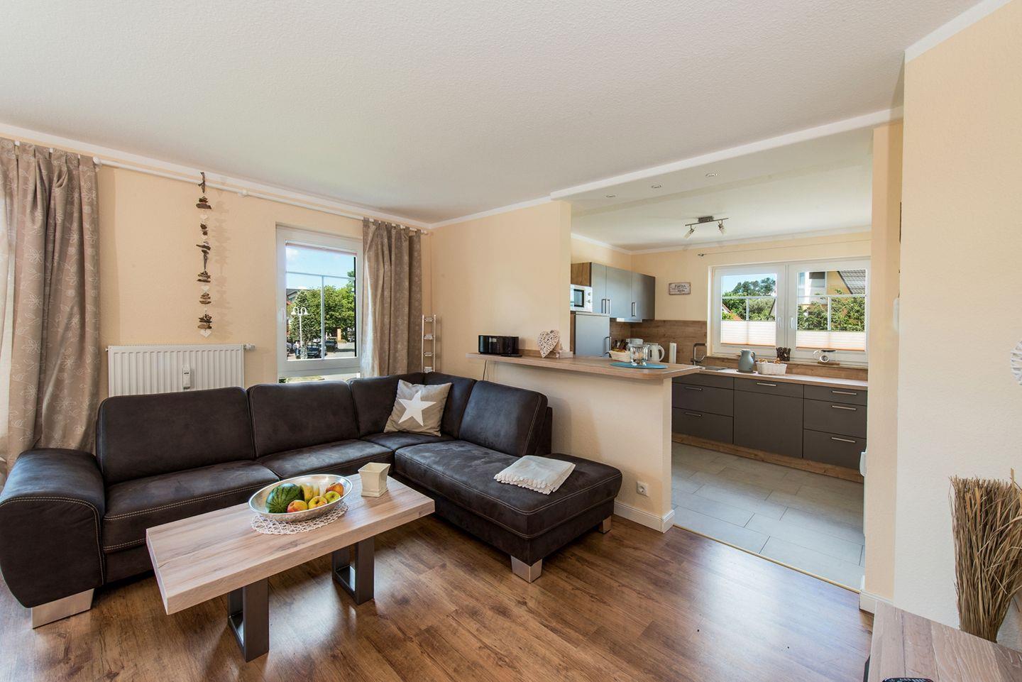 Die 64 qm große Wohnung liegt in der 1. Etage und kann mit bis zu 4 Personen angemietet werden. Die Wohnung verfügt über einen Westbalkon und einen großzügigen Wohnbereich mit Essecke, der in die offene Küche übergeht. Eines der Schlafzimmer ist mit einem Doppelbett ausgestattet, das andere mit einem 1,40 m breiten französischen Bett. Beide Zimmer verfügen über einen zusätzlichen Fernseher. Die Fenster sind mit Fliegengittern versehen und für die Fahrräder steht ein Fahrradschuppen zur Verfügung.
