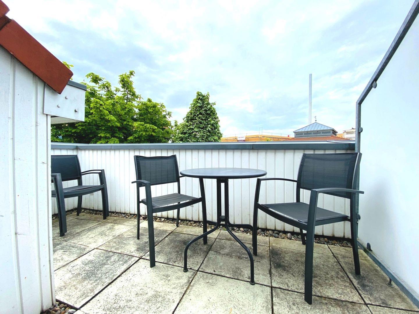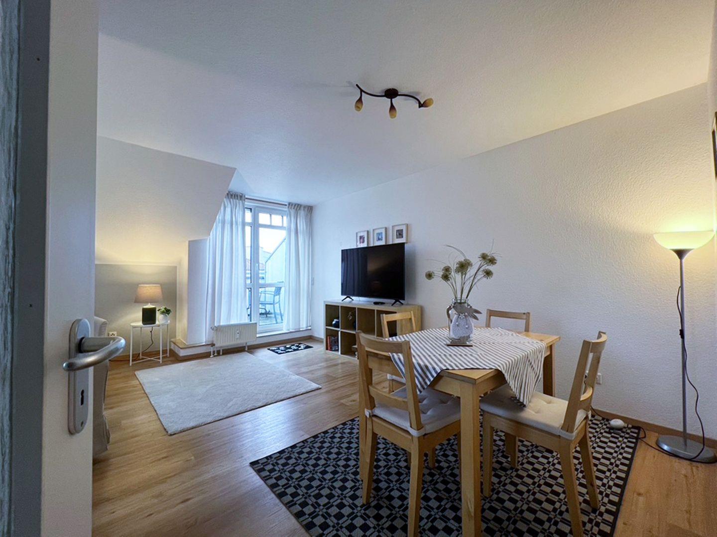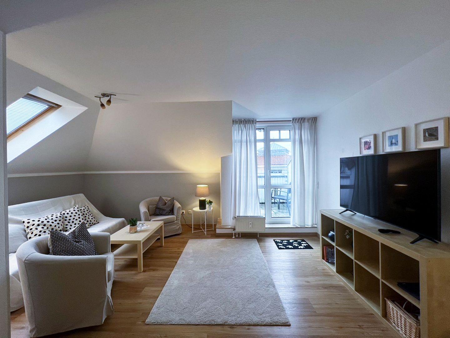 Die 52 qm große Wohnung liegt im 2. Obergeschoss und wird für bis zu 2 Erwachsene und 2 Kinder vermietet. In den Wohnbereich gelangen Sie auf den möblierten Südbalkon. Die separate Küche schließt sich direkt an das Wohnzimmer an. Das Schlafzimmer ist mit einem Doppelbett und einem Fernseher ausgestattet, im Wohnzimmer steht eine Schlafcouch für bis zu 2 Personen zur Verfügung. Das Badezimmer ist mit Dusche und WC versehen. Ein Gemeinschaftsschuppen steht für Fahrräder zur Verfügung.
