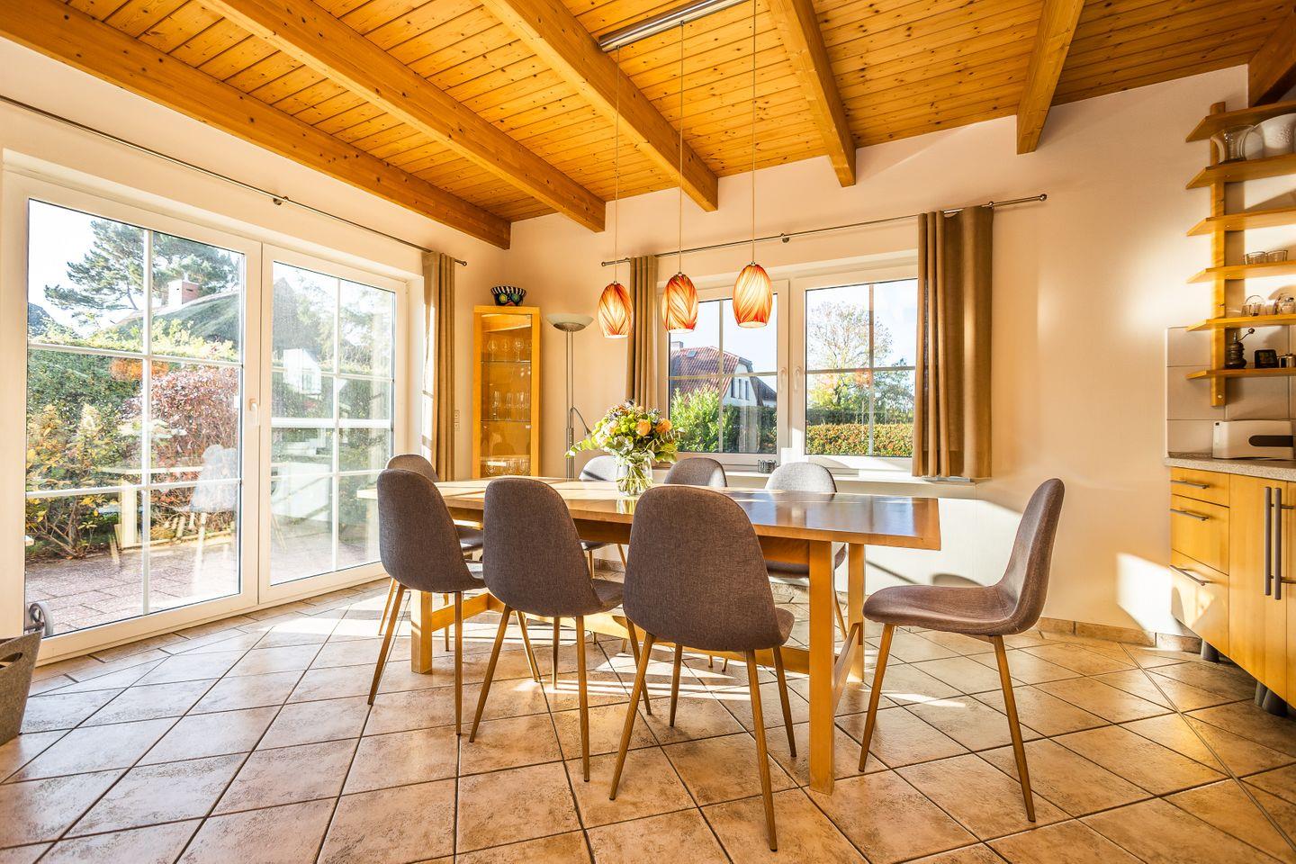 Das 140 qm große Ferienhaus liegt im Ortskern von Zingst. Das Haus wird für max. 8 Personen vermietet. Im Erdgeschoss befinden sich ein sehr großer Wohn-Essbereich mit integrierter Küche und daran anschließend eine große Südterrasse mit Gartenanteil. Ein Schlafzimmer mit Ehebett und ein Bad mit Dusche und WC sind ebenfalls hier. In der oberen Etage sind drei weitere Schlafzimmer, eines mit Ehebett und zwei mit zwei Einzelbetten sowie ein weiteres Bad mit Wanne/Dusche und WC. Das Haus verfügt über eine Waschmaschine. Es stehen 2 PKW-Stellplätze zur Verfügung. Die Wallbox ist gegen Gebühr nutzbar. Buchbar sind 1 Woche für 100 € oder 2 Wochen für 150 €.
