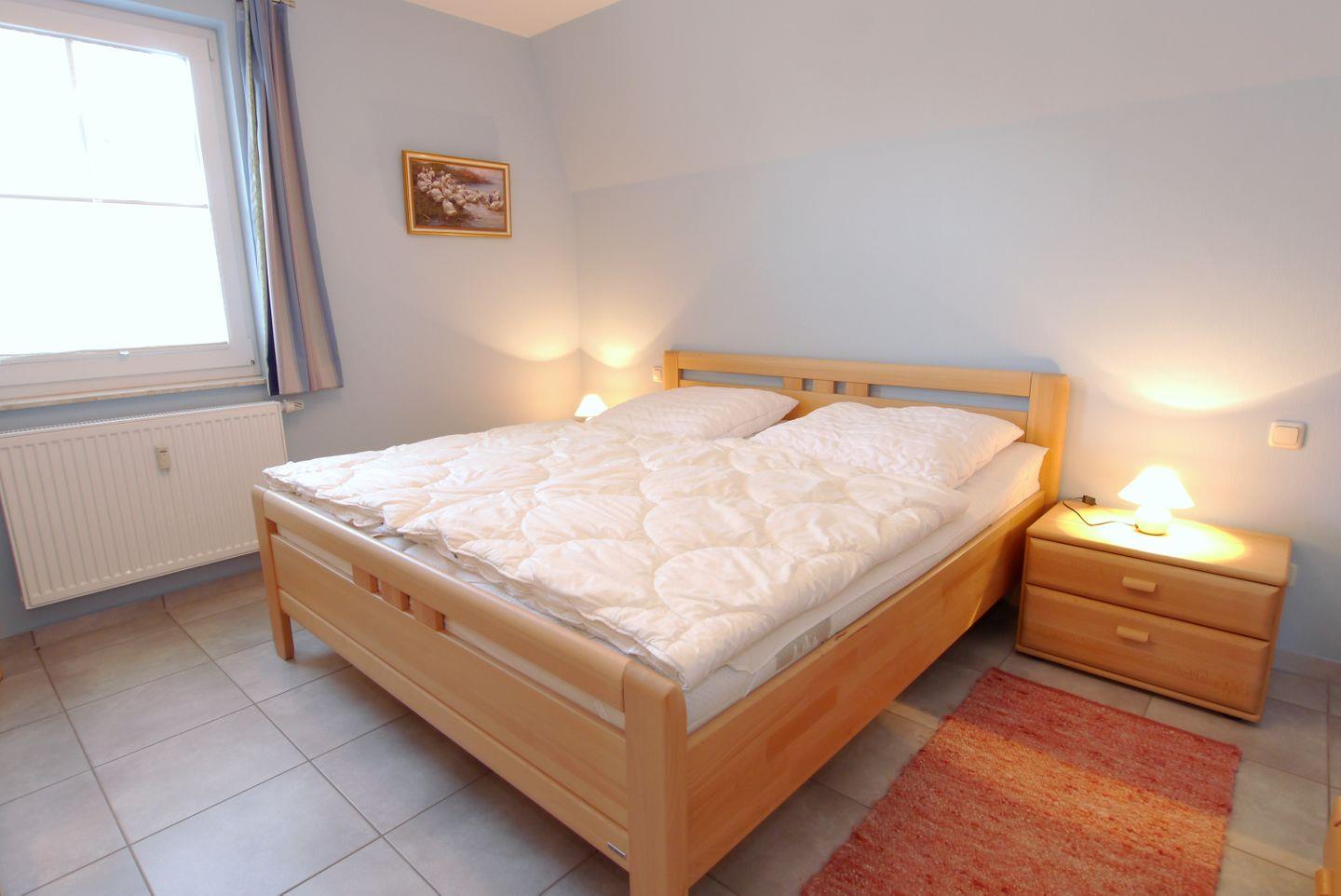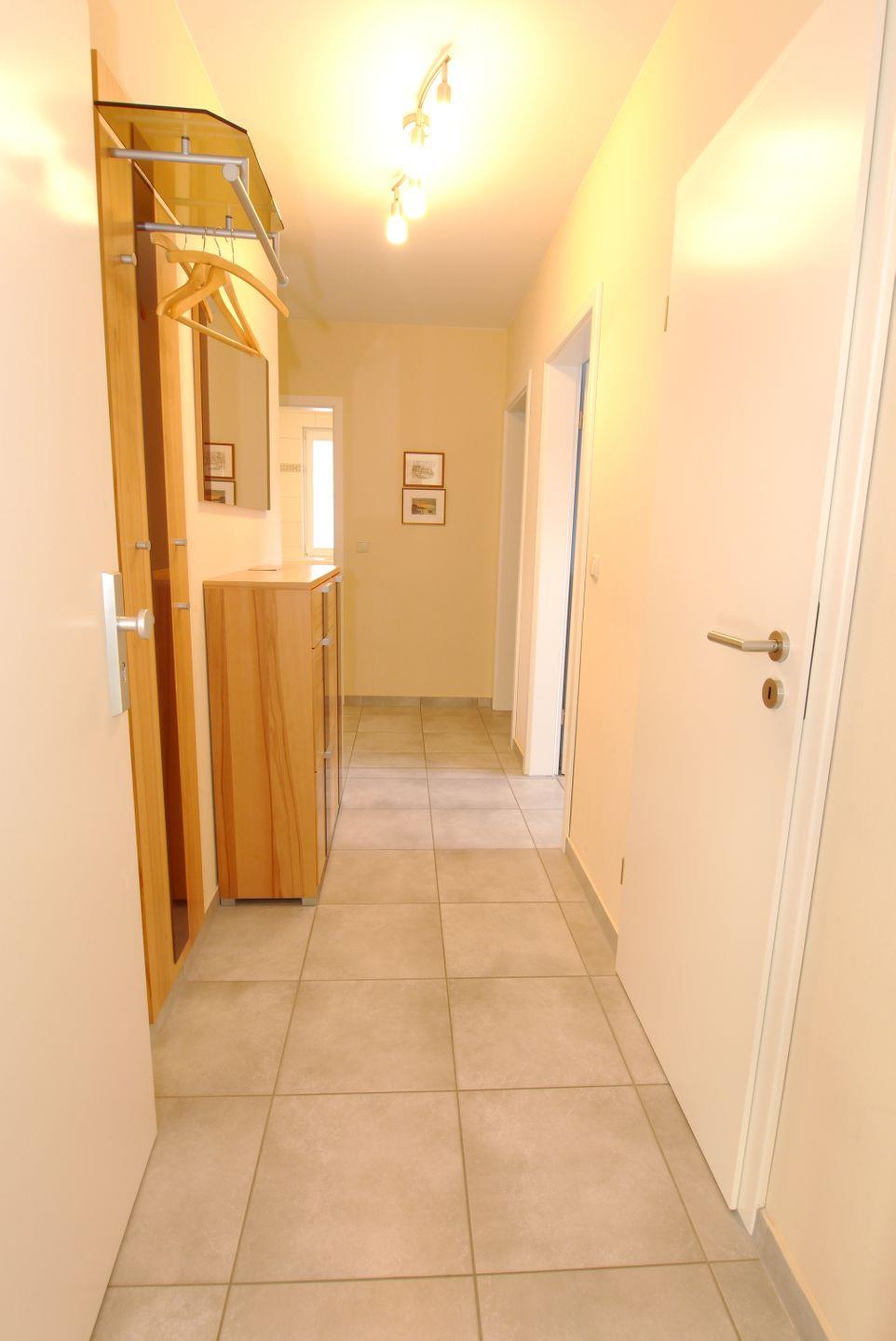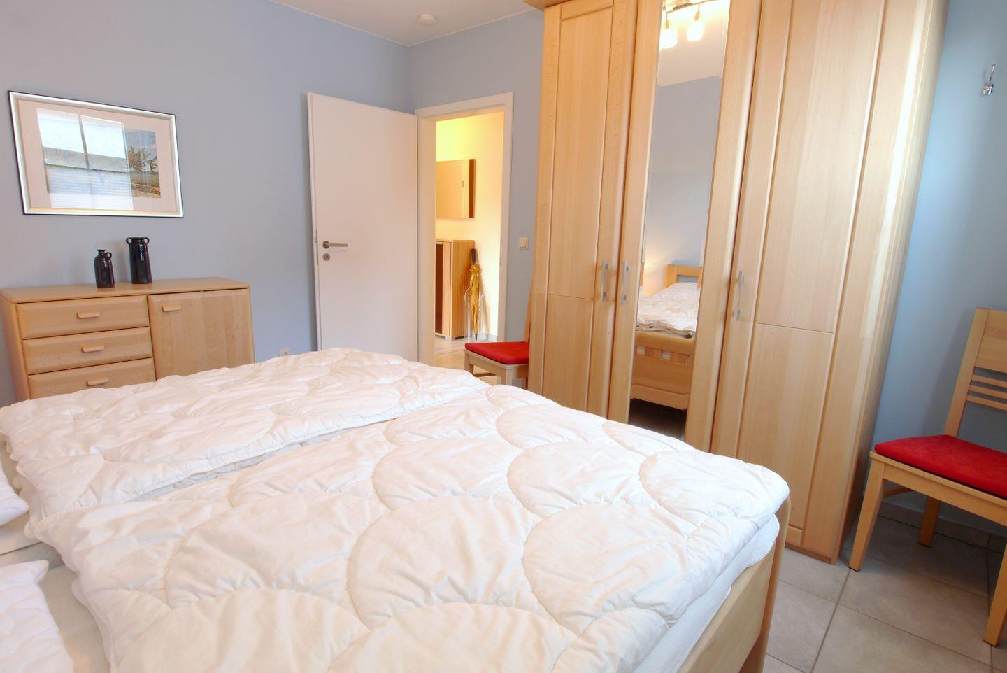 Diese 65 m² große Wohnung liegt in der 1. Etage und wird für maximal 2 Erwachsene + 2 Kinder vermietet. Über den Flur mit Garderobe und Schuhschrank gelangt man in den Wohnraum mit Essbereich und Küchenzeile. Von hier erreichen Sie auch den Südbalkon. Von den beiden Schlafzimmern hat eines ein Doppelbett, das andere zwei Einzelbetten, beide sind mit Kleiderschränken eingerichtet. Das Badezimmer ist mit einer Glasdusche und einem Doppelwaschbecken mit Spiegelschrank ausgestattet. Zur Wohnung gehören ein Fahrradkeller und ein Carport.