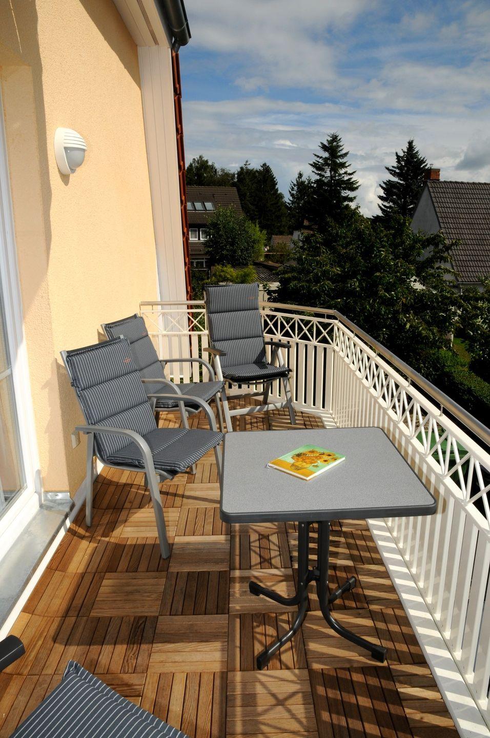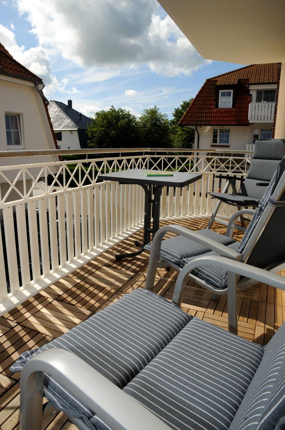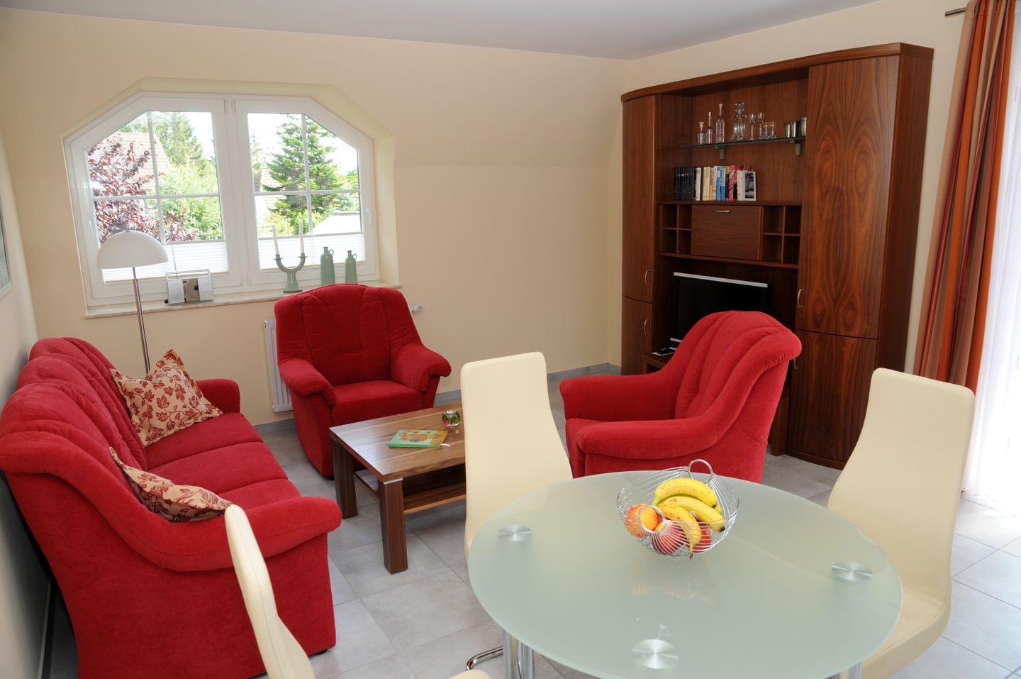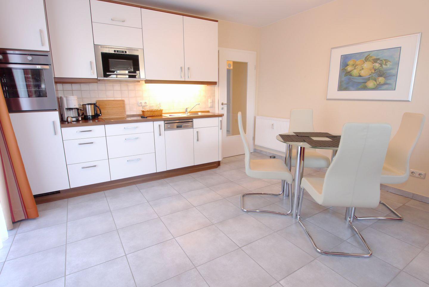 Diese 65 m² große Wohnung liegt in der 1. Etage und wird für maximal 2 Erwachsene + 2 Kinder vermietet. Über den Flur mit Garderobe und Schuhschrank gelangt man in den Wohnraum mit Essbereich und Küchenzeile. Von hier erreichen Sie auch den Südbalkon. Von den beiden Schlafzimmern hat eines ein Doppelbett, das andere zwei Einzelbetten, beide sind mit Kleiderschränken eingerichtet. Das Badezimmer ist mit einer Glasdusche und einem Doppelwaschbecken mit Spiegelschrank ausgestattet. Zur Wohnung gehören ein Fahrradkeller und ein Carport.