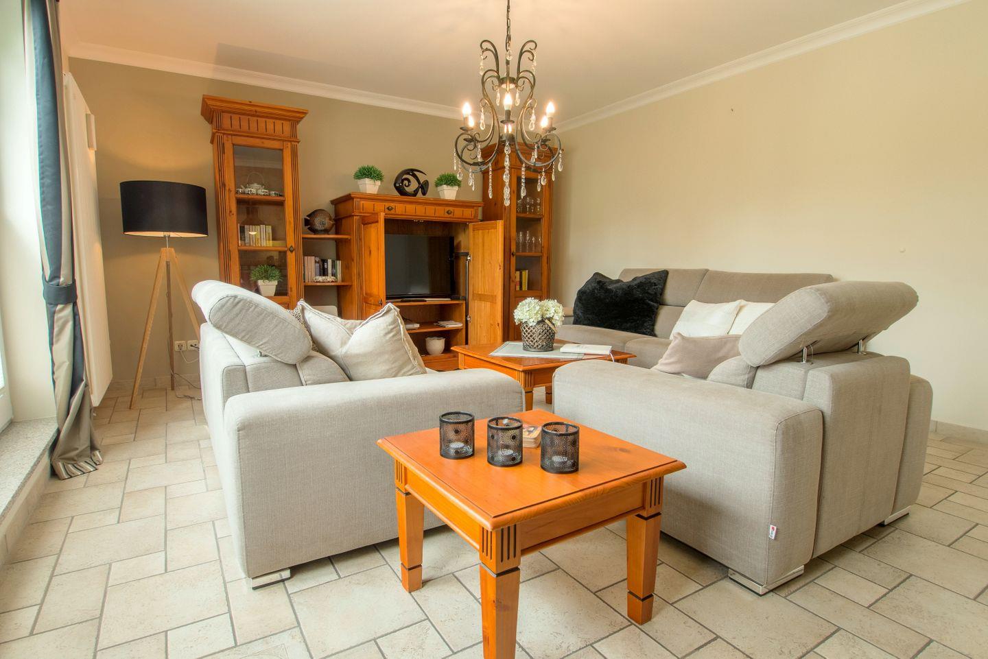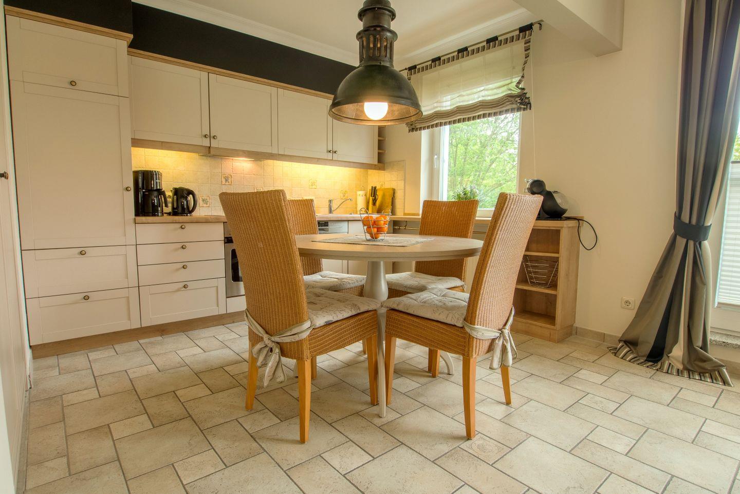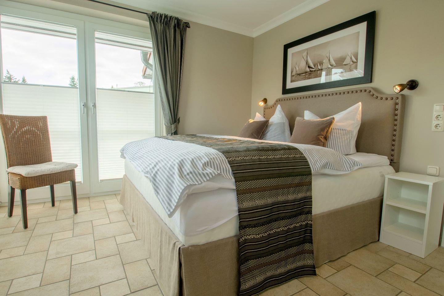 Diese 80 m² große Obergeschosswohnung liegt in der 1. Etage und kann mit bis zu 4 Personen belegt werden. Der Wohnbereich geht in die Essecke und die separierte Küchenzeile über, hier ist auch der Zugang zum Westbalkon zu finden. Die beiden Schlafzimmer sind jeweils mit einem Doppelbett und zusätzlichem Fernseher versehen. Im Badezimmer ist ein großer gefliester Duschbereich zu finden, eine Begrenzung durch eine Kabine gibt es hier nicht. Zusätzlich stehen ein Gäste-WC und ein Fahrradschuppen zur Verfügung.