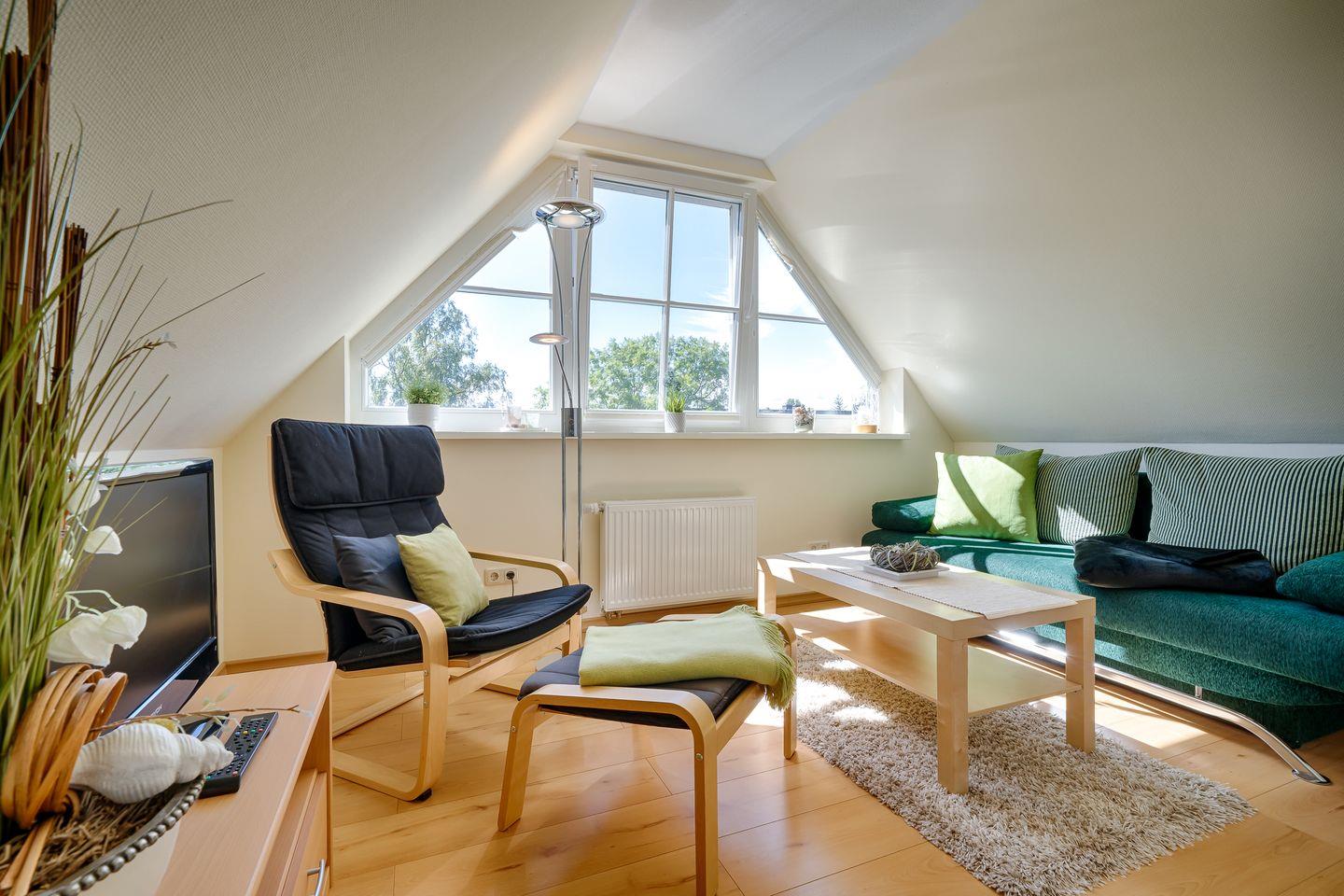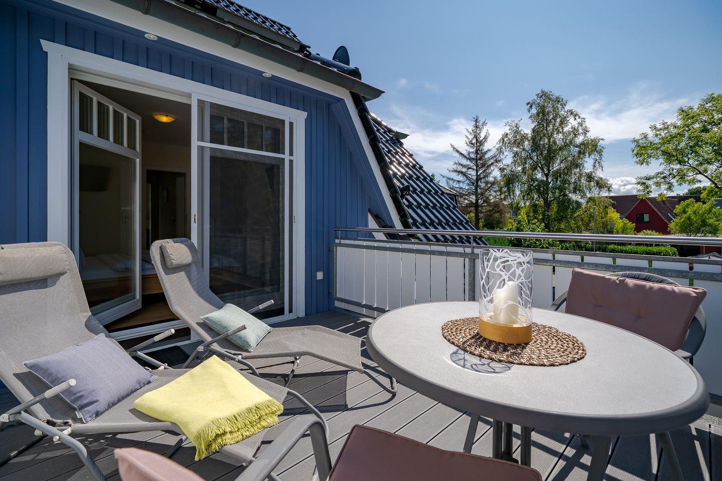1 Schlafzimmer mit Doppelbett (1,80x2,00m), verstellbaren Lattenroste, TV und Dachterrasse (Westen)