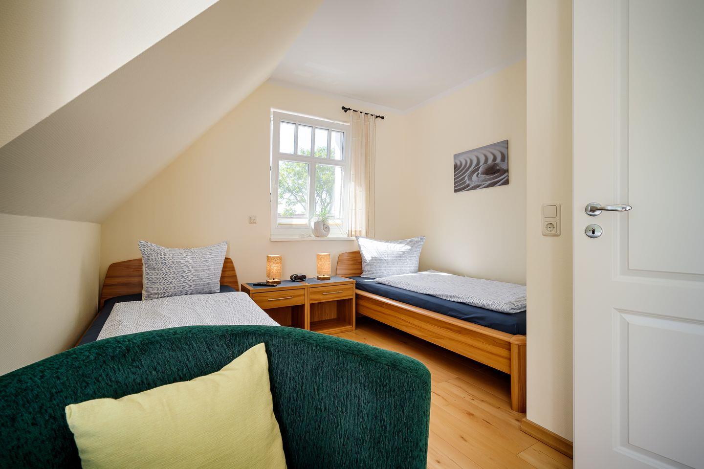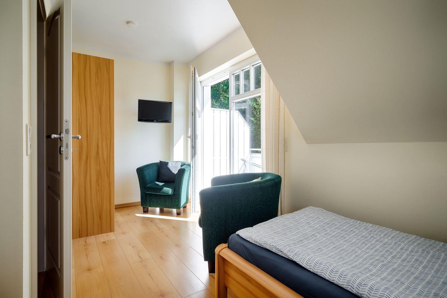 1 Schlafzimmer mit 2 Einzelbetten (0,90x2,00m), TV und Balkon (Osten)