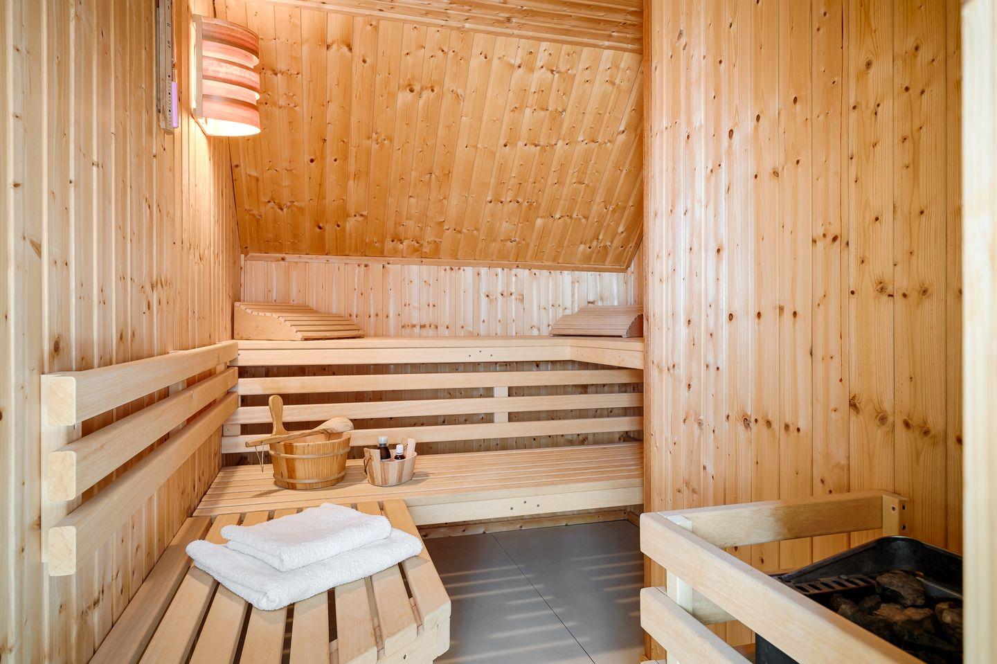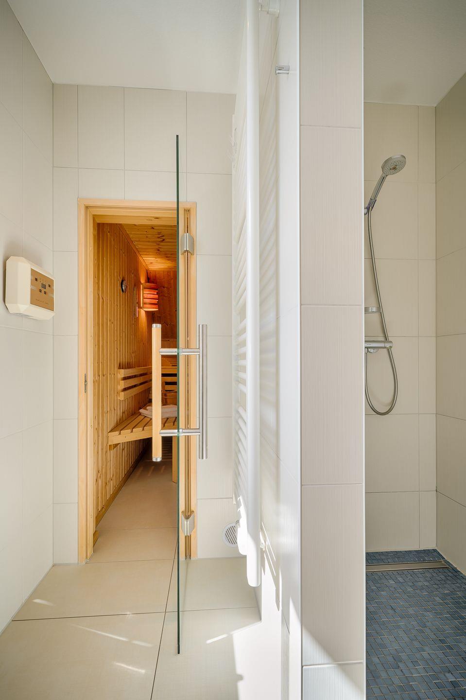 Bad mit ebenerdiger Dusche, Sauna (ohne Gebühren)
