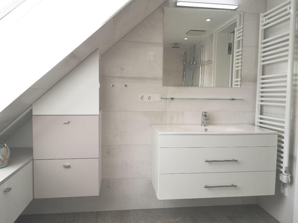 großzügiges Bad mit Fenster, ebenerdiger Wellnessdusche und Einbauten, beleuchteter Kosmetikspiegel mit Vergrößerung