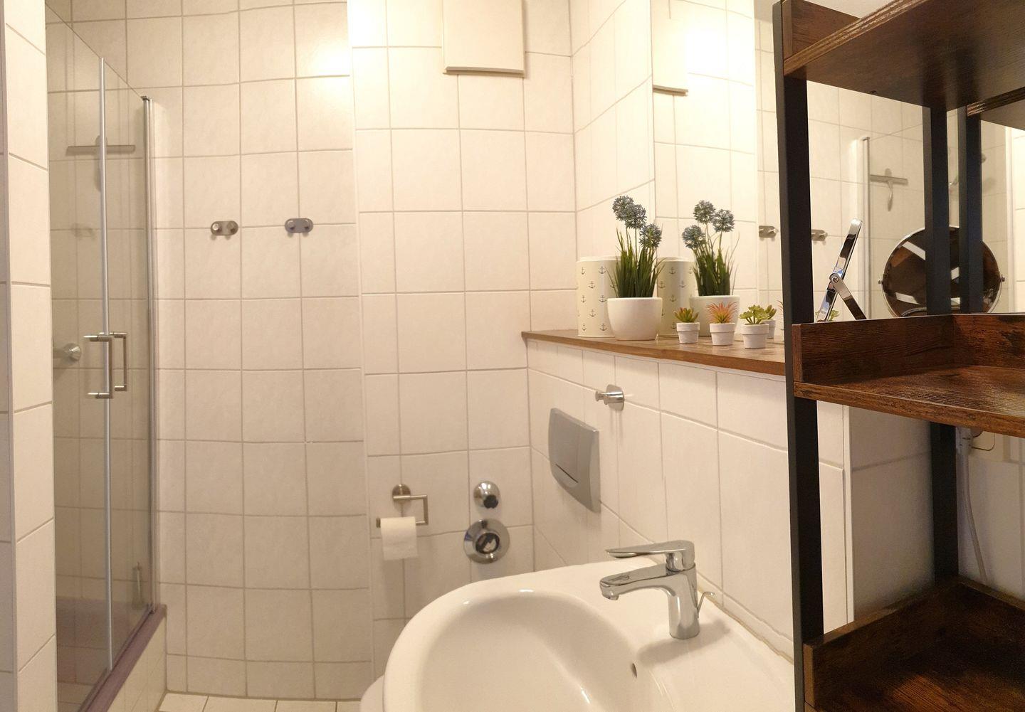Im unteren Bereich der Wohnung finden Sie auch das Badezimmer mit Dusche, Haartrockner und einer Waschmaschine.