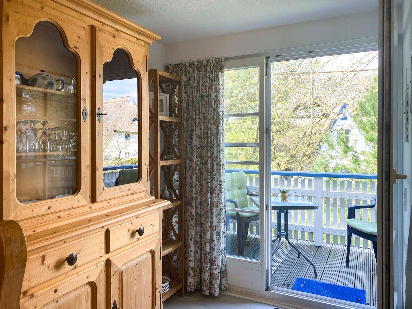 In der 1. Etage ist das Wohnzimmer mit Zugang zum möblierten Westbalkon und Blick in die begrünte Anlage zu finden. Die separate Küche ist umfangreich ausgestattet, hier gibt es auch eine kleine Essecke und eine Waschmaschine. Das Badezimmer wurde komplett renoviert und mit einer ebenerdigen Glasdusche versehen.