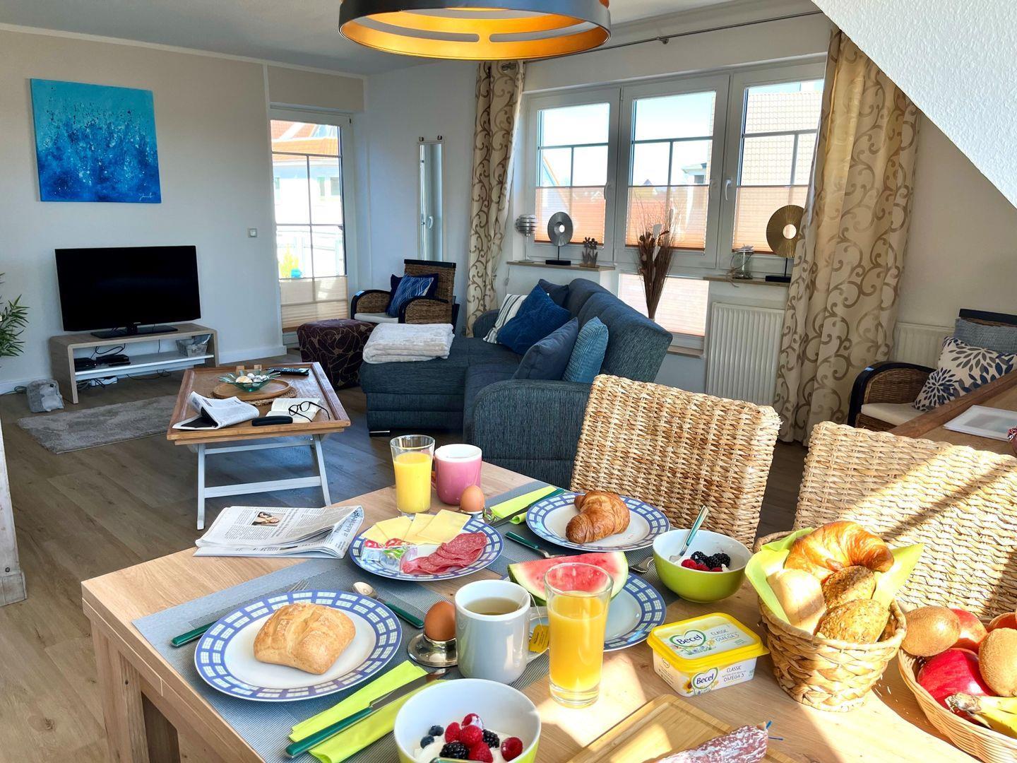 Das großzügige Wohnzimmer mit Essbereich geht in eine offene Küche über. Das Schlafzimmer ist mit einem Doppelbett ausgestattet, im Wohnbereich befindet sich ein gemütliches Schlafsofa.