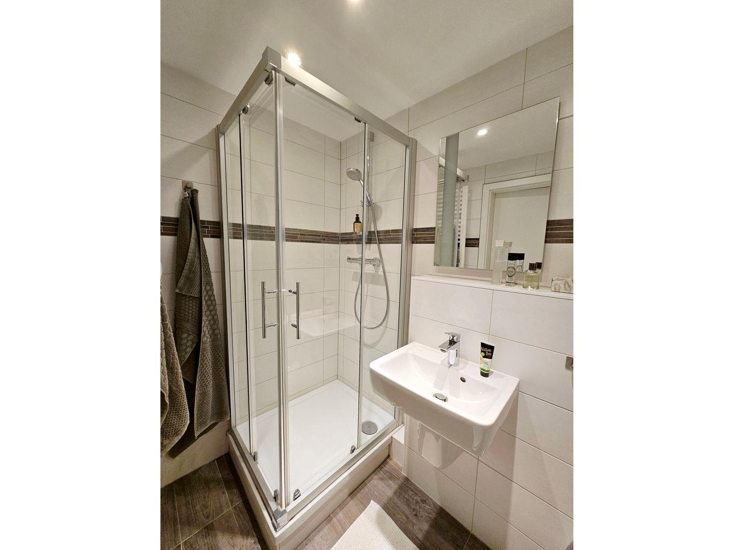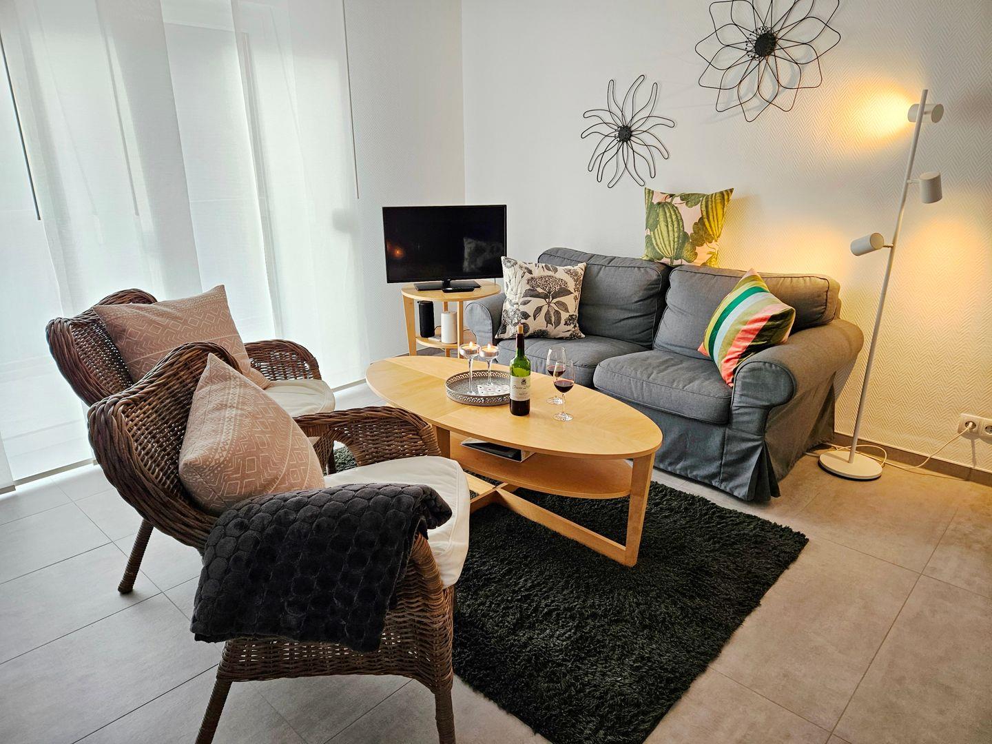 Die Wohnung verfügt über 2 komfortable Schlafzimmer, die jeweils mit hochwertigem Laminatboden ausgestattet sind und für eine entspannte Nachtruhe sorgen. Ein modernes Bad mit Dusche und Badewanne sowie ein weiteres Badezimmer mit Dusche garantieren höchsten Komfort für bis zu vier Gäste. Das großzügige Wohnzimmer mit seinen stilvollen Fliesen lädt zum Verweilen ein und bietet mit einer Sofaecke und einem Esstisch genügend Platz, um nach einem erlebnisreichen Tag zusammenzukommen. Genießen Sie die Unterhaltung durch zwei digitale Fernseher und bleiben Sie dank kostenloses WLAN immer verbunden.
