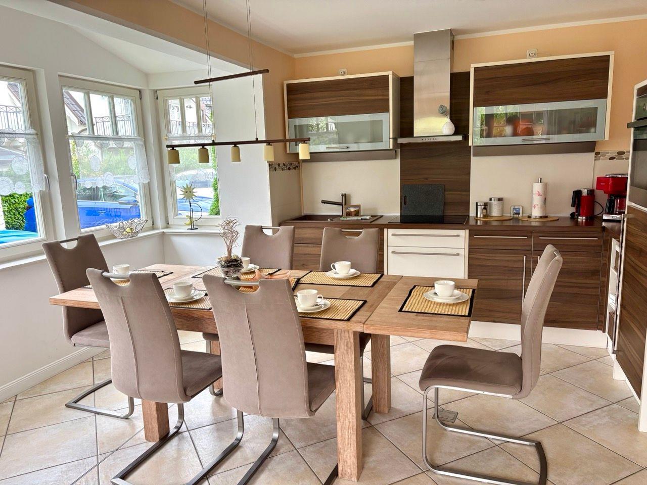 offenen, voll ausgestatteten Küche. Ein großer Esstisch, ein Ecksofa und Lesesessel, der