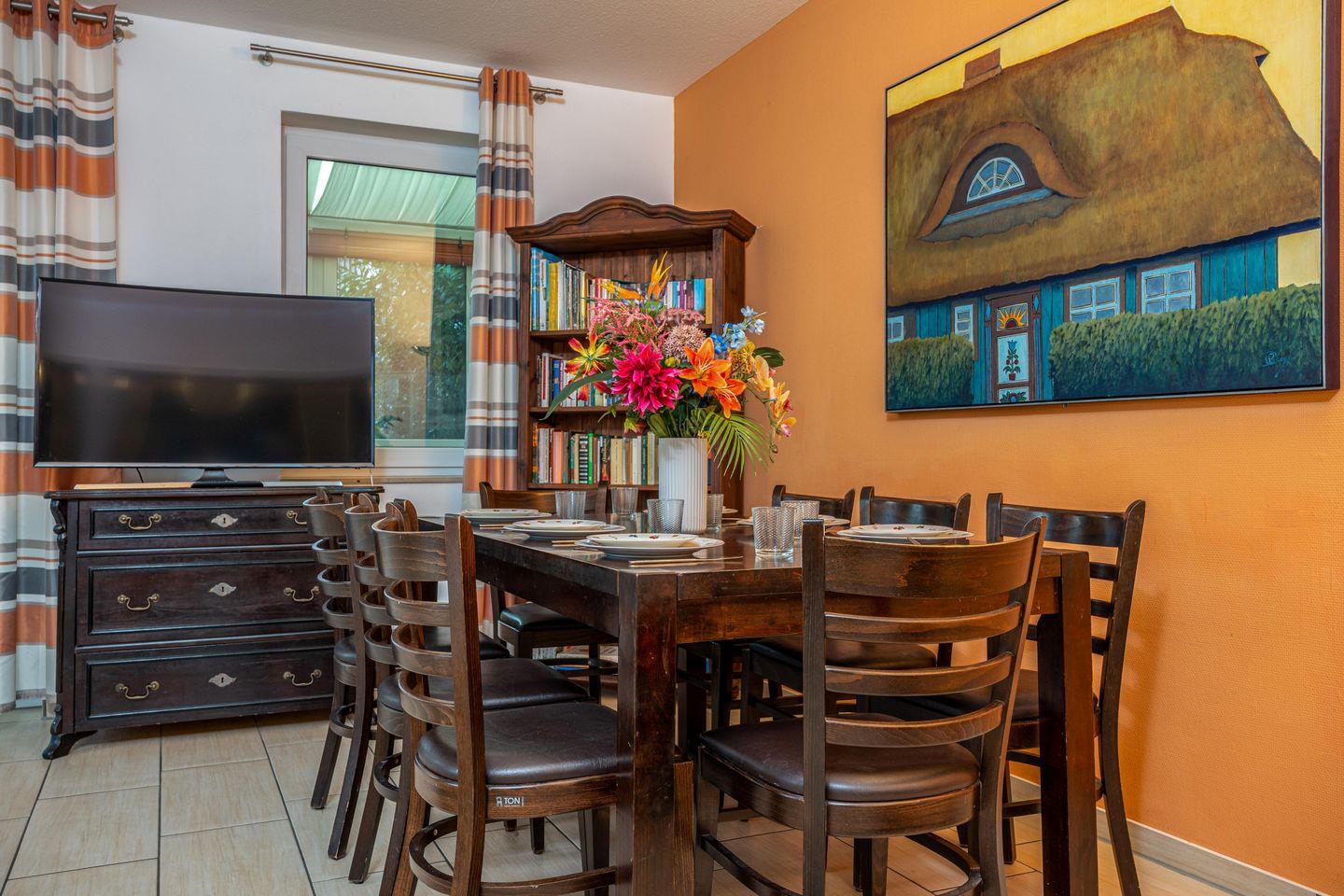Das Feriendomizil Wiesenhaus lädt zum Urlaub in Zingst ein. Die Unterkunft bietet Platz für 8 Personen. In der unteren Etage befindet sich das gemütliche Wohnzimmer mit großem Esstisch und Blick in den Gartenbereich. Zwei Schlafzimmer sind mit Doppelbetten ausgestattet und zwei Zimmer mit jeweils 2 Einzelbetten. Die große Terrasse und der schöne Gartenbereich lädt zum Entspannen ein. Den wunderschönen Strand von Zingst ist nur 2 km entfernt.
