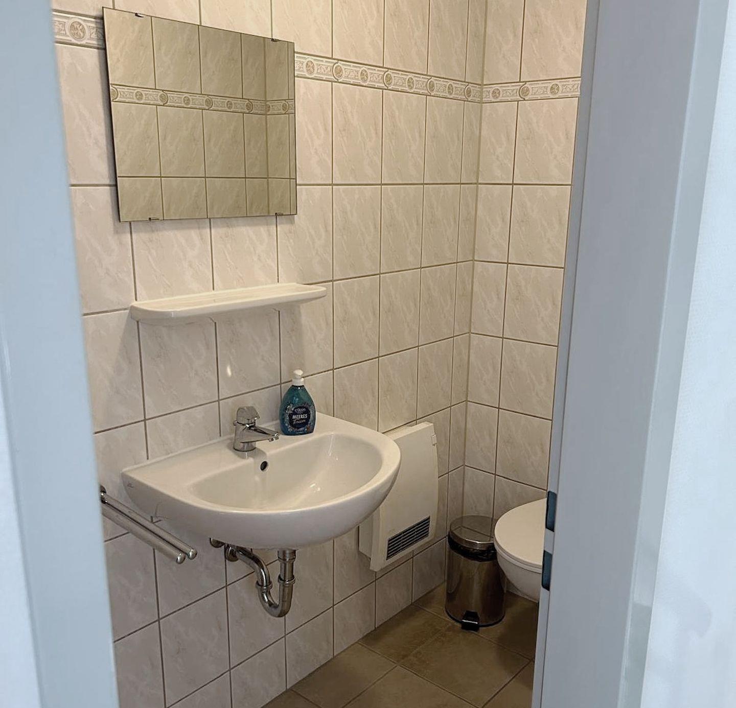 Das Badezimmer ist mit einer Dusche, Waschbecken und Haartrockner ausgestattet und bietet Tageslicht durch Fenster. Zusätzlich steht Ihnen ein separates Gäste-WC zur Verfügung. Fliegengitter und Sichtschutz an allen Fenstern sorgen für Komfort.