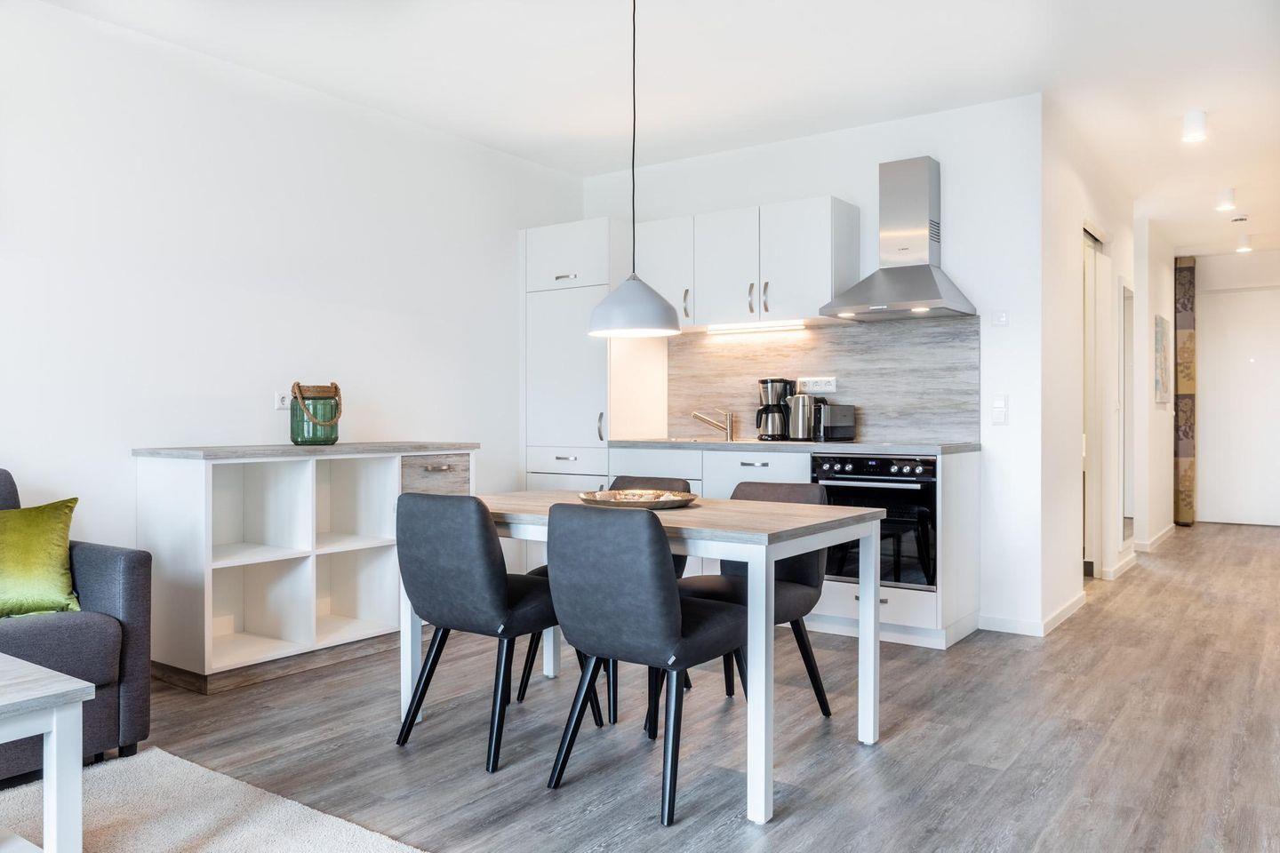 Das lichtdurchflutete und familienfreundliche Nichtraucher-Apartment verfügt über Fußbodenheizung, sonnenschutzverglaste und bodentiefe Fensterflächen, kostenfreies WLAN und eine voll ausgestattete offene Küche mit Geschirrspüler, Kühlschrank und Gefrierfach, Kaffeemaschine, Eierkocher, Toaster, Wasserkocher, Herd mit Glaskeramikkochfeld und Backofen.