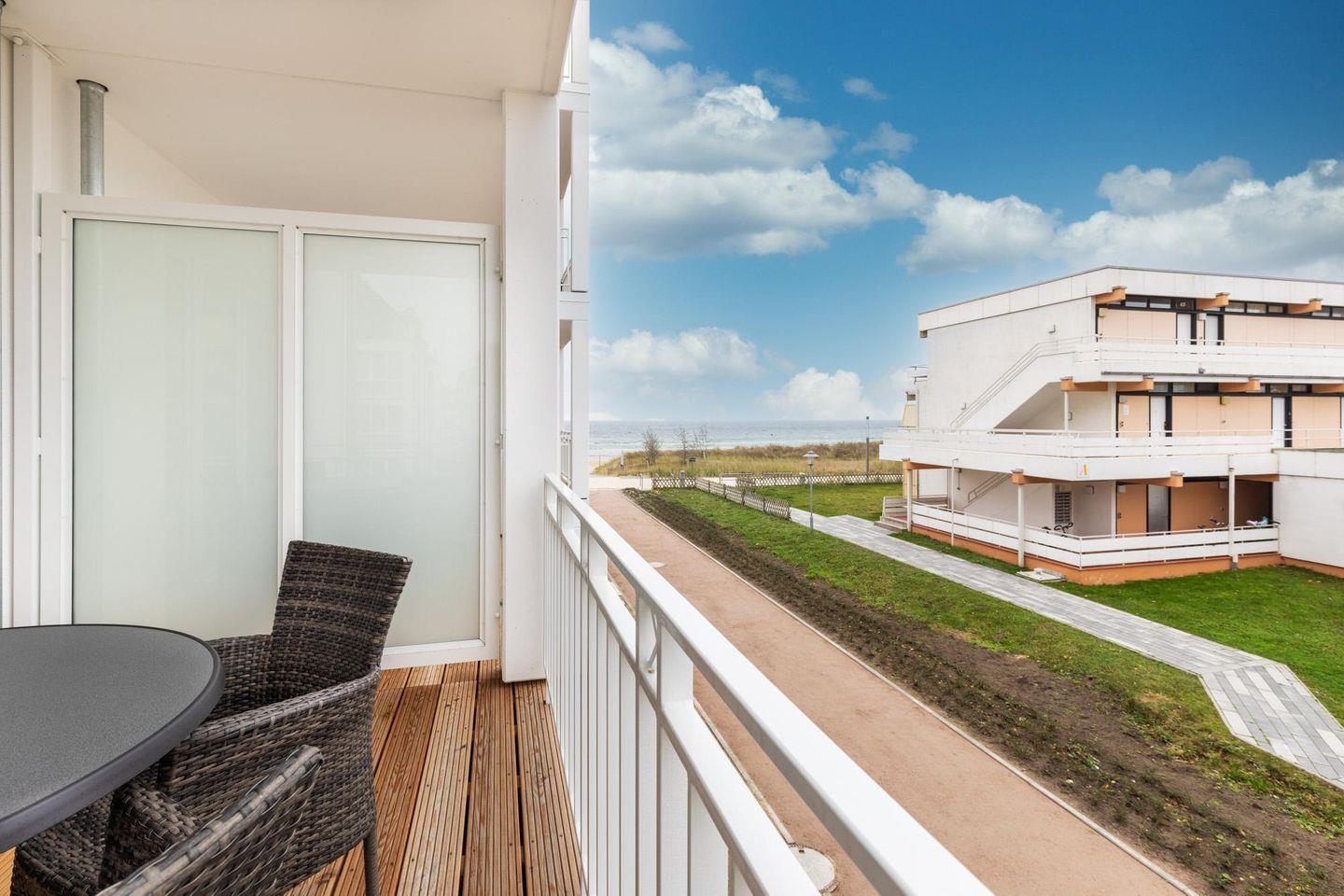 Entspannte und sonnige Stunden mit seitlichem Blick auf die Ostsee verbringt ihr auf dem überdachten und mit Gartenmöbeln ausgestatteten Balkon in Süd-West-Lage. Der Balkon ist vom Wohnbereich aus zugänglich.