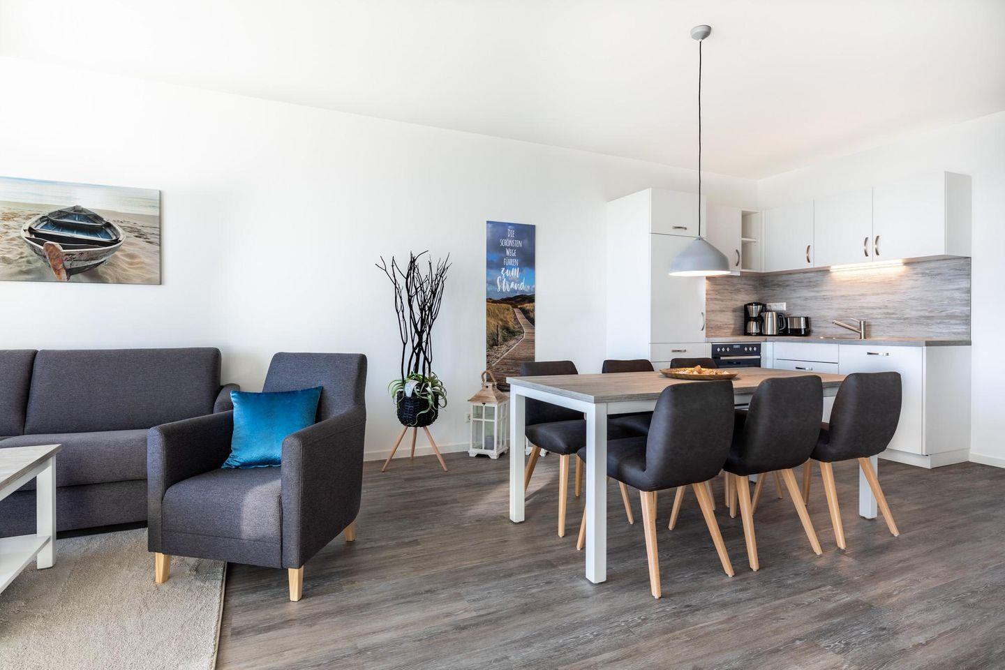 Im modern-behaglichen Wohn-Essbereich befindet sich eine Doppelschlafcouch (1,60 x 1,95 m) und ein großer Flatscreen-TV (43 Zoll). Beide separaten Schlafzimmer bieten hohen Schlafkomfort durch jeweils zwei moderne Boxspringbetten (0,90 x 2,00 m) und sind mit jeweils einem Flatscreen-TV (40 Zoll) und Kleiderschrank ausgestattet. Zwei stilvolle Badezimmer bieten jeweils eine ebenerdige Regendusche, WC, Waschtisch mit Föhn, Handtuchheizkörper und Fußbodenheizung. So beginnt ihr euren Urlaubstag schon morgens ganz entspannt.