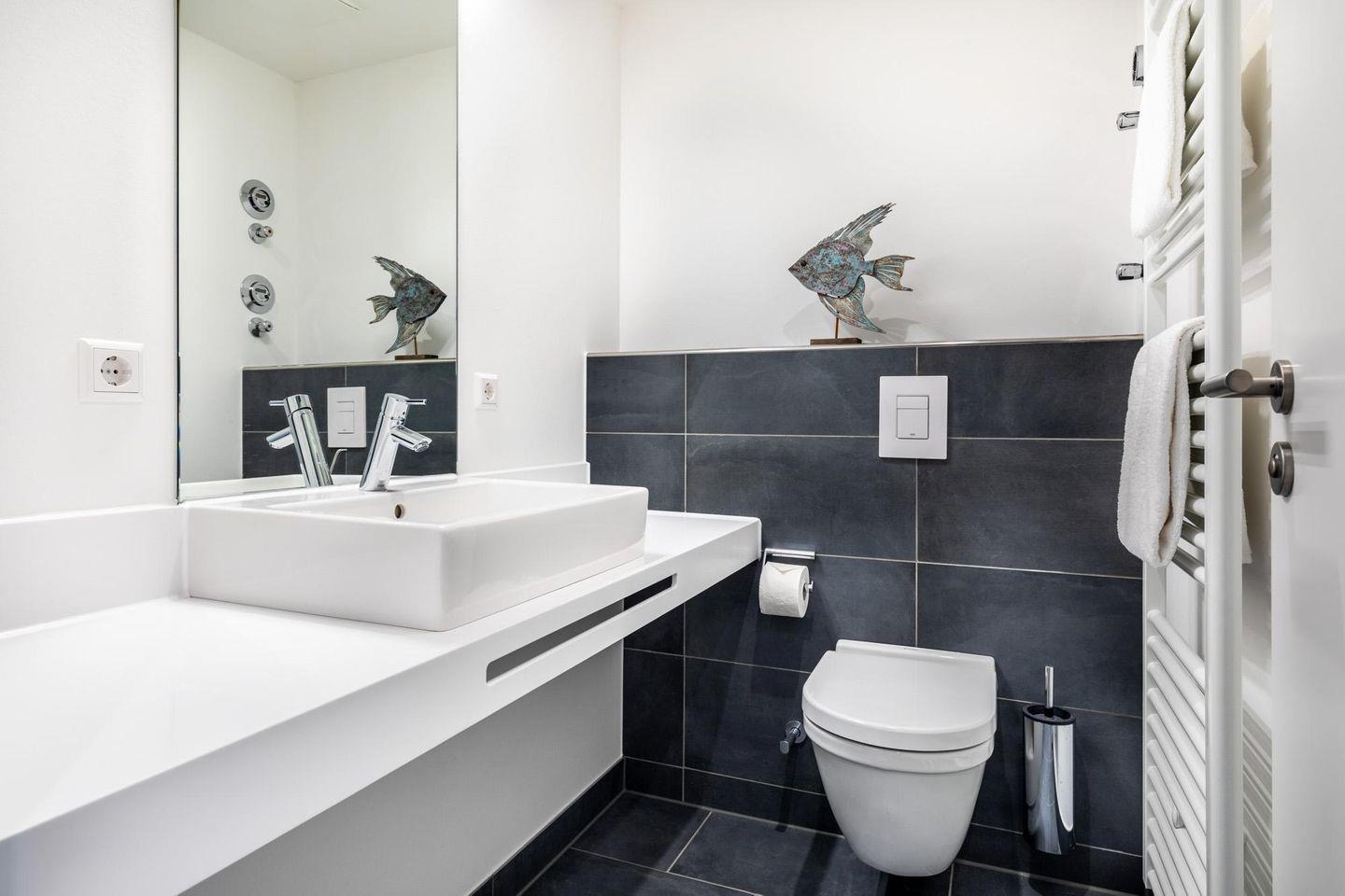 Im modern-behaglichen Wohn-Essbereich befindet sich eine Doppelschlafcouch (1,60 x 1,95 m), eine Bluetooth Musikbox und ein großer Flatscreen-TV (43 Zoll). Beide separaten Schlafzimmer bieten hohen Schlafkomfort durch jeweils zwei moderne Boxspringbetten (0,90 x 2,00 m) und sind mit jeweils einem Flatscreen-TV (40 Zoll) und Kleiderschrank ausgestattet. Zwei stilvolle Badezimmer bieten jeweils eine ebenerdige Regendusche, WC, Waschtisch mit Föhn, Handtuchheizkörper und Fußbodenheizung. So beginnt ihr euren Urlaubstag schon morgens ganz entspannt.