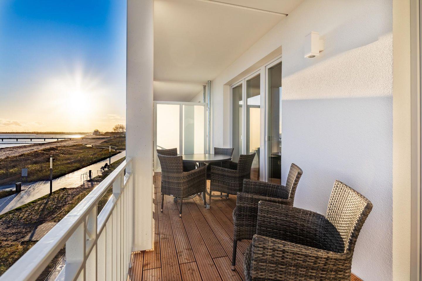 Entspannte und sonnige Stunden mit Panoramablick auf die See verbringt ihr auf dem großzügigen 10 qm großen Balkon in Süd-Ost-Lage. Der Balkon ist mit Gartenmöbeln ausgestattet und sowohl vom Wohnbereich als auch von einem der Schlafzimmer aus begehbar.