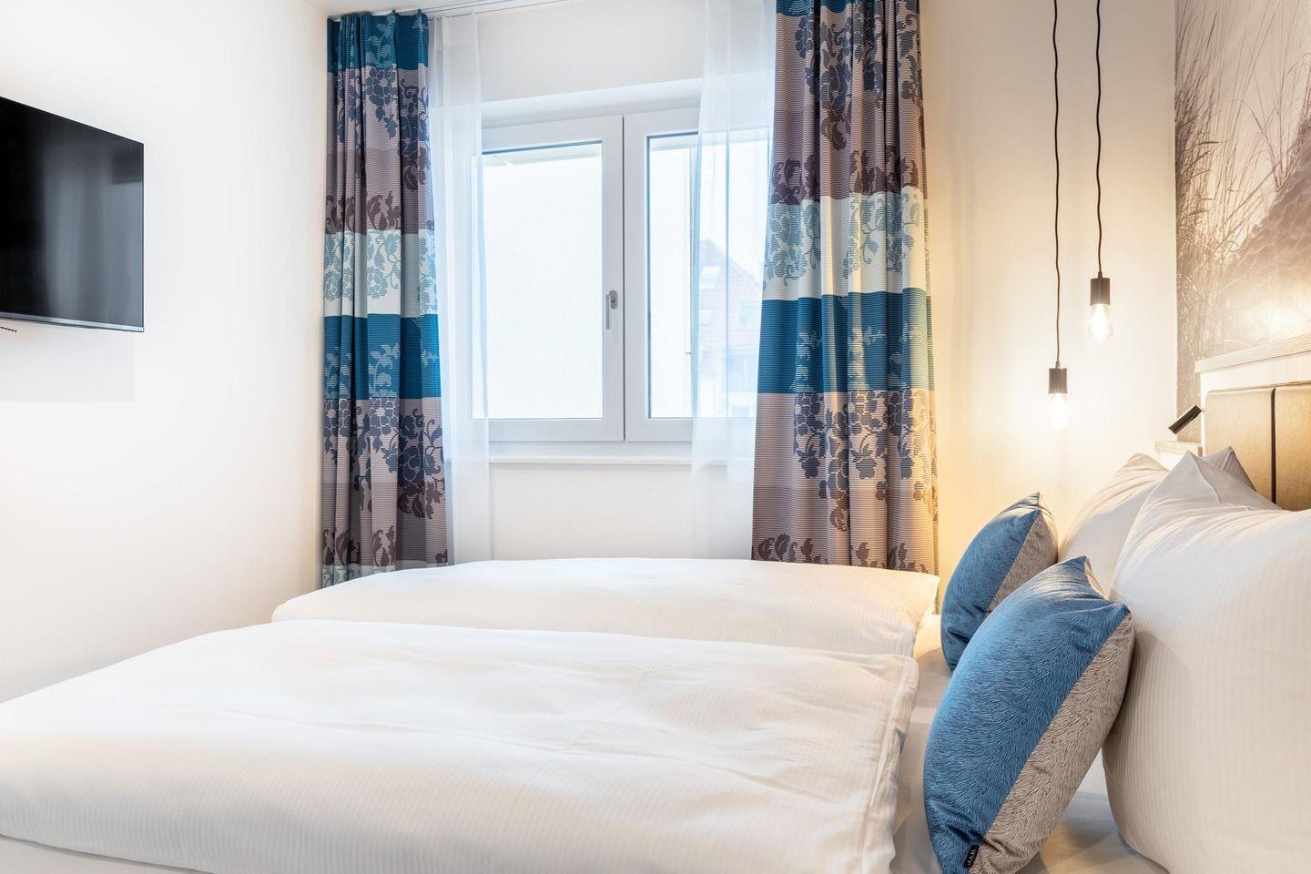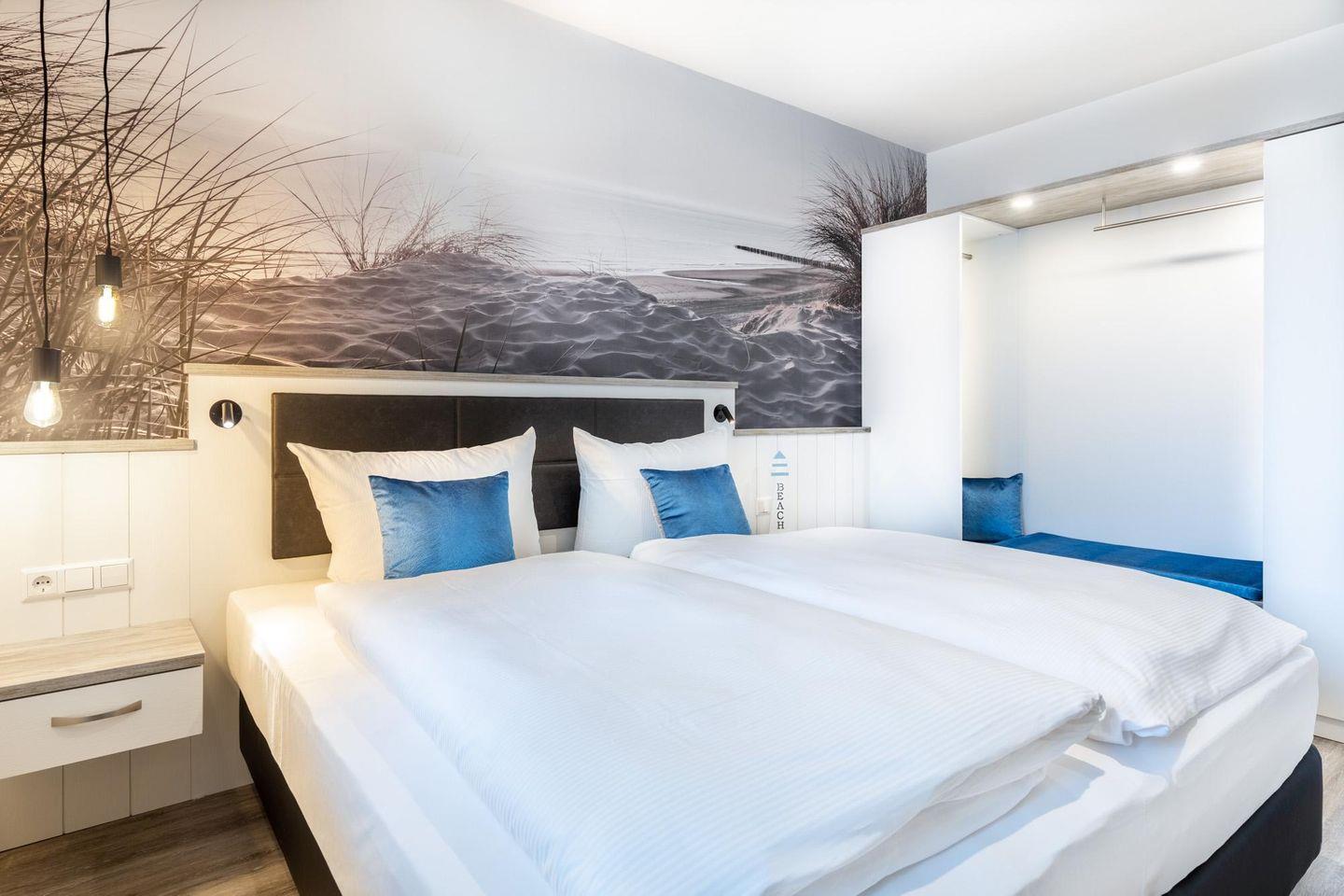 Im modern-behaglichen Wohn-Essbereich befindet sich eine Doppelschlafcouch (1,60 x 1,95 m) und ein großer SMART-TV (65 Zoll). Beide separaten Schlafzimmer bieten hohen Schlafkomfort durch jeweils zwei moderne Boxspringbetten (0,90 x 2,00 m) und sind mit jeweils einem Flatscreen-TV (40 Zoll) und Kleiderschrank ausgestattet. Zwei stilvolle Badezimmer bieten jeweils eine ebenerdige Regendusche, WC, Waschtisch mit Föhn, Handtuchheizkörper und Fußbodenheizung. So beginnt ihr euren Urlaubstag schon morgens ganz entspannt.
