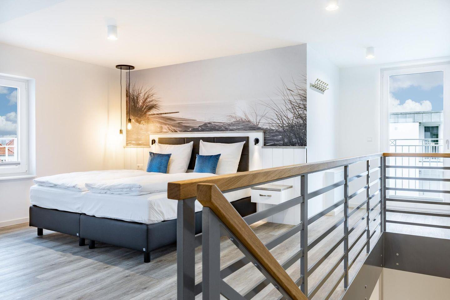 Über die Treppe im Entree gelangt ihr auf die großzügig konzipierte Wohnebene mit Galerie im Dachgeschoss. Hier befindet sich ein zweites Bad mit Badewanne, WC, Waschtisch mit Föhn, Handtuchheizkörper und Fußbodenheizung. Der Schlafbereich auf der Galerie verfügt ebenfalls über zwei modernen Boxspringbetten (0,90 x 2,00 m) und Flatscreen-TV (40 Zoll). Auch auf dieser Ebene befindet sich eine Art französischer Balkon, der fast über die ganze nordwestlich gelegene Seite verläuft. Des Weiteren steht euch in der Saison als Gast dieses Apartments ein Strandkorb am Strand zur Verfügung!