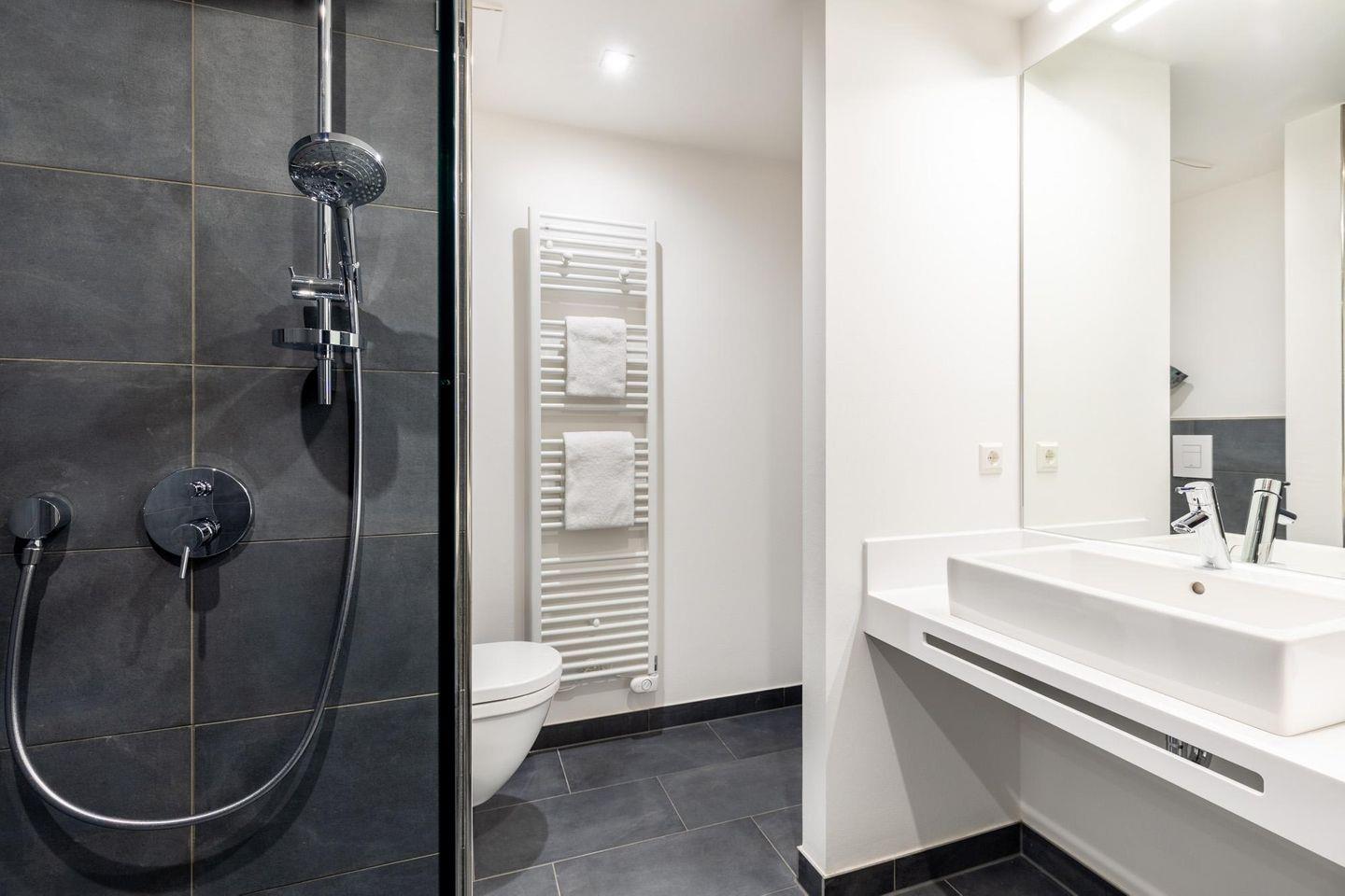 Das stilvolle Badezimmer auf dieser Wohnebene verfügt über eine ebenerdige Regendusche, WC, Waschtisch mit Föhn, Handtuchheizkörper und Fußbodenheizung. Entspannte und sonnige Stunden mit Blick bis zur Ostsee verbringt ihr auf dem überdachten und mit Gartenmöbeln ausgestatteten Balkon in Süd-West-Lage. Der Balkon ist vom Wohnbereich aus zugänglich.
