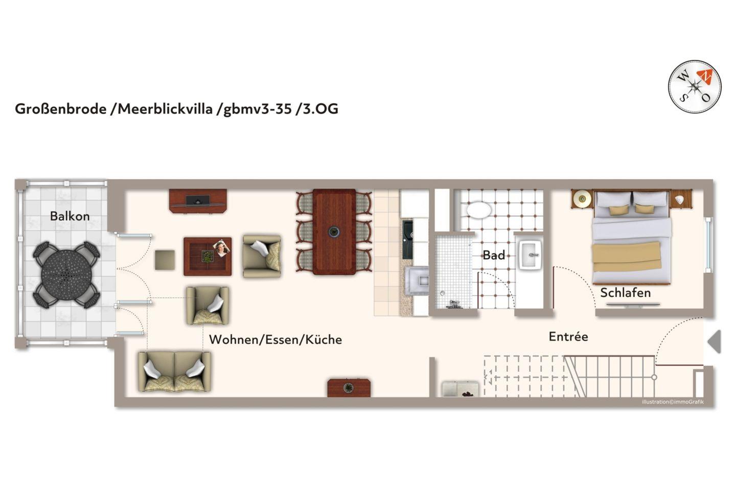 Über die Treppe im Entree gelangt ihr auf die großzügig konzipierte Wohnebene mit Galerie im Dachgeschoss. Hier befindet sich ein zweites Bad mit Badewanne, ebenerdiger Regendusche, WC, Waschtisch mit Föhn, Handtuchheizkörper und Fußbodenheizung. Der Schlafbereich auf der Galerie verfügt ebenfalls über zwei moderne Boxspringbetten (0,90 x 2,00 m), Flatscreen-TV (40 Zoll), Kleiderschrank und Sitz-/Kofferbank sowie über eine Doppelschlafcouch (1,60 x 1,95 m). Auch diese Ebene besitzt einen Balkon in sonniger Süd-West-Lage; hier sogar mit eigenem Strandkorb. Der seitliche Blick auf das Meer und den vorgelagerten Strand ist einfach einmalig schön.