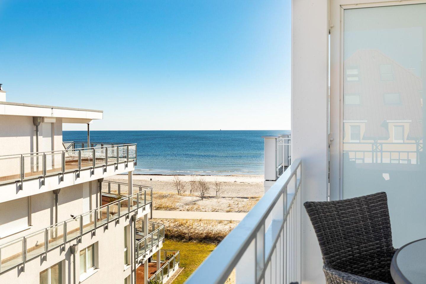 Entspannte Stunden mit Blick bis zur Ostsee verbringt ihr auf dem überdachten und mit Gartenmöbeln ausgestatteten Balkon in Nord-Ost-Lage. Der Balkon ist vom Wohnbereich aus zugänglich. Durch den über die nordwestliche Seite verlaufenden Austritt - ähnlich einem französischen Balkon - ist das Apartment besonders lichtdurchflutet.