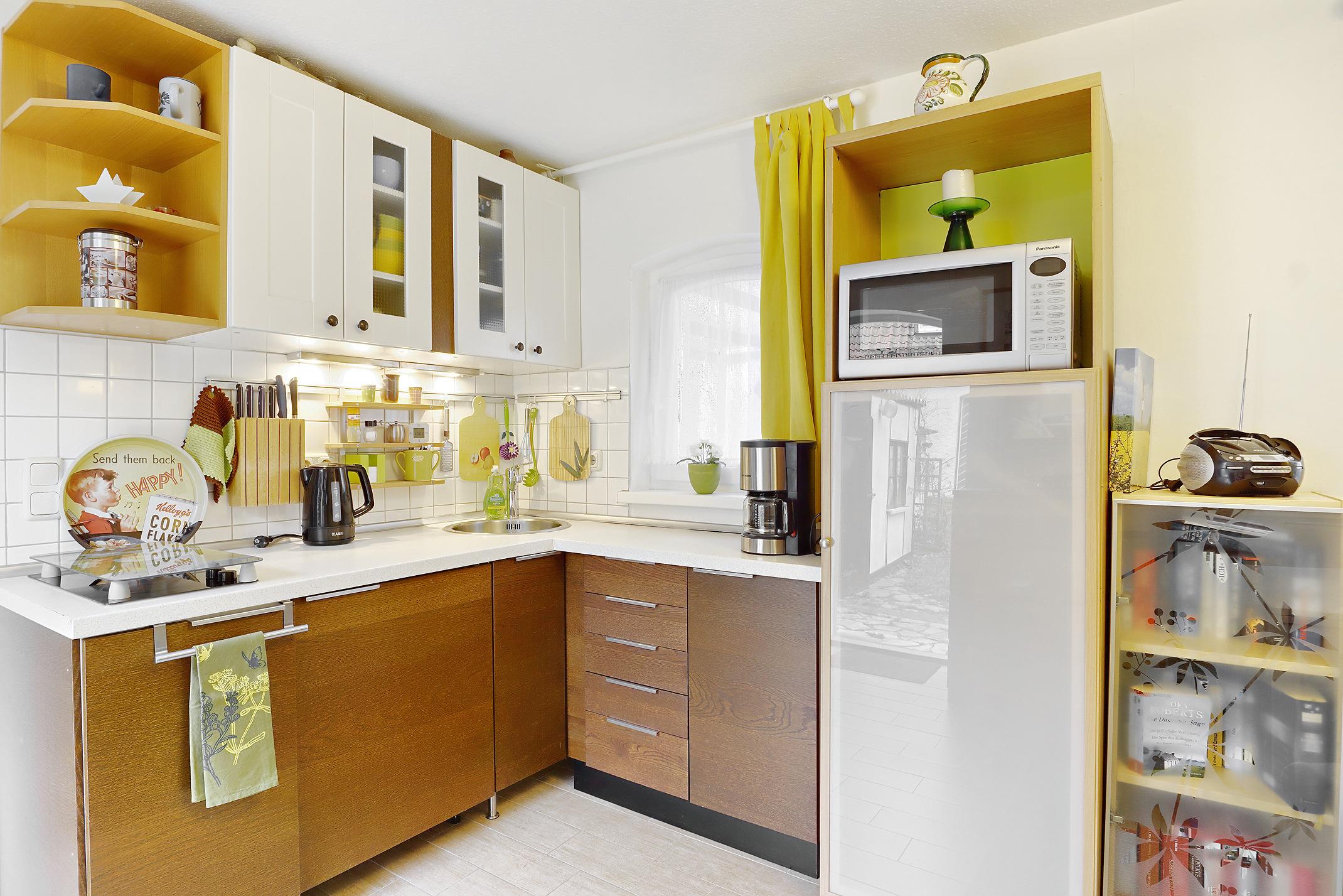 * einer Küchenzeile mit 2-Kreis-Ceranfeld, Kühlschrank mit Tiefkühlfach, Mikrowelle, Kaffeemaschine, Wasserkocher, Toaster und ansonsten vom Eierpieker bis zum Kochlöffel alles, was man so braucht, wenn man im Urlaub keinen Wert auf eine Geschirrspülmaschine etc. legt.