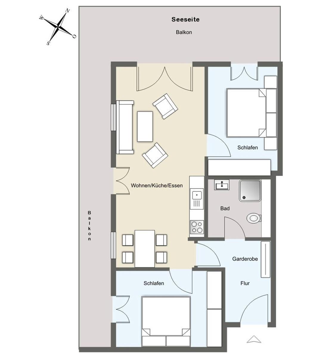 Die Ferienwohnung ist mit zwei Schlafräumen, einem Wohnbereich, einer komplett eingerichteten Küchenzeile und einem Duschbad ausgestattet. WLAN ist in diesem Apartment verfügbar. Von allen Zimmern haben Sie Zugang zum großen Eckbalkon. Genießen Sie die Sonne vom Süd-West-Balkon oder den Blick auf die Ostsee und dem Kurpavillon vom Nord-West-Balkon und lauschen Sie den Wellen der Ostsee.