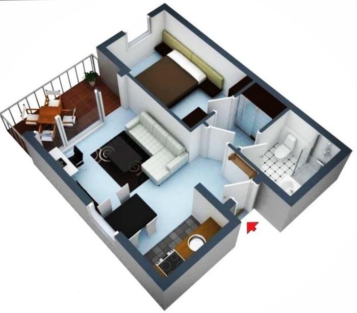 Das 2-Raum-Apartment (ca. 42 m²) umfasst ein Wohnzimmer mit offener Küche, Schlafzimmer und ein Bad mit Dusche, Toilette, Schminkspiegel, Badhocker und Fön.