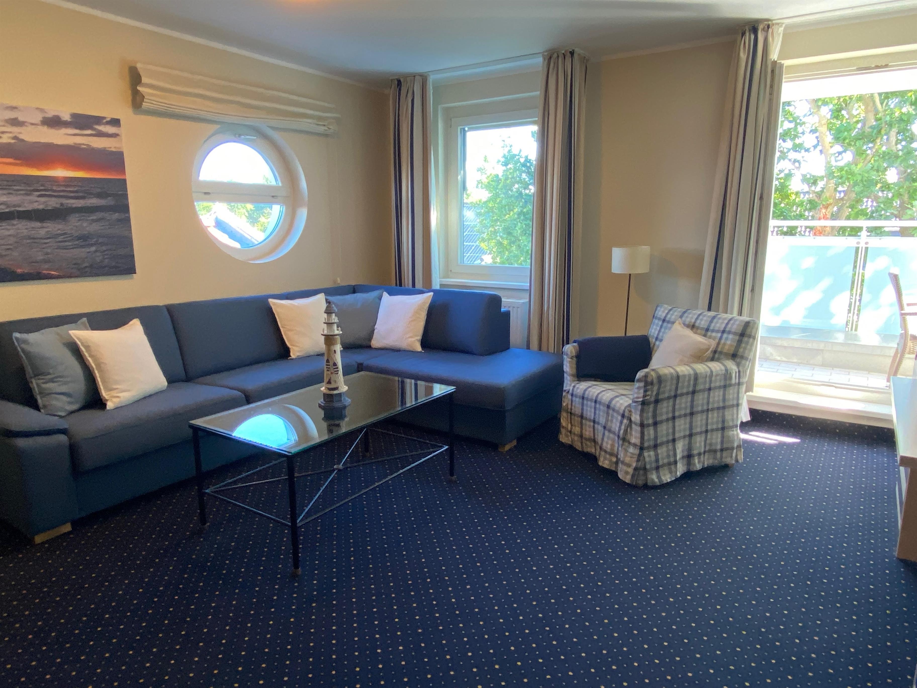 Vom Balkon blickt man durch Baumwipfel nach Osten in Richtung der Insel Hiddensee und erlebt einen traumhaften Sonnenaufgang. Auf dem möblierten Balkon können Sie ihr Frühstück genießen und den Tag ruhig bei einem schönen Glas Wein ausklingen lassen. In unserem hellen, geschmackvollen Nichtraucher- Appartement erwartet Sie ein ansprechend ausgestatteter Wohnbereich mit hochwertiger Schlafcoach.