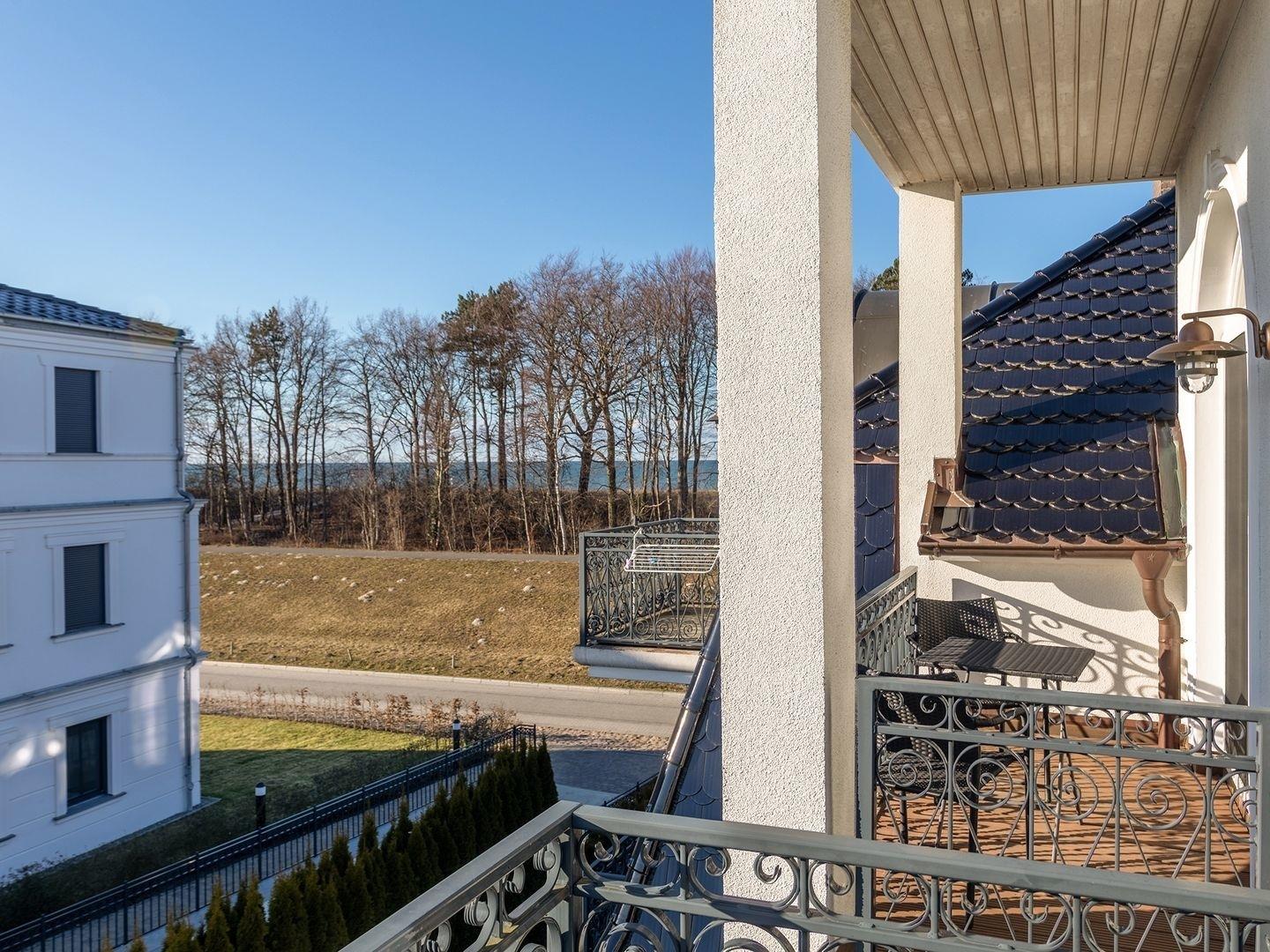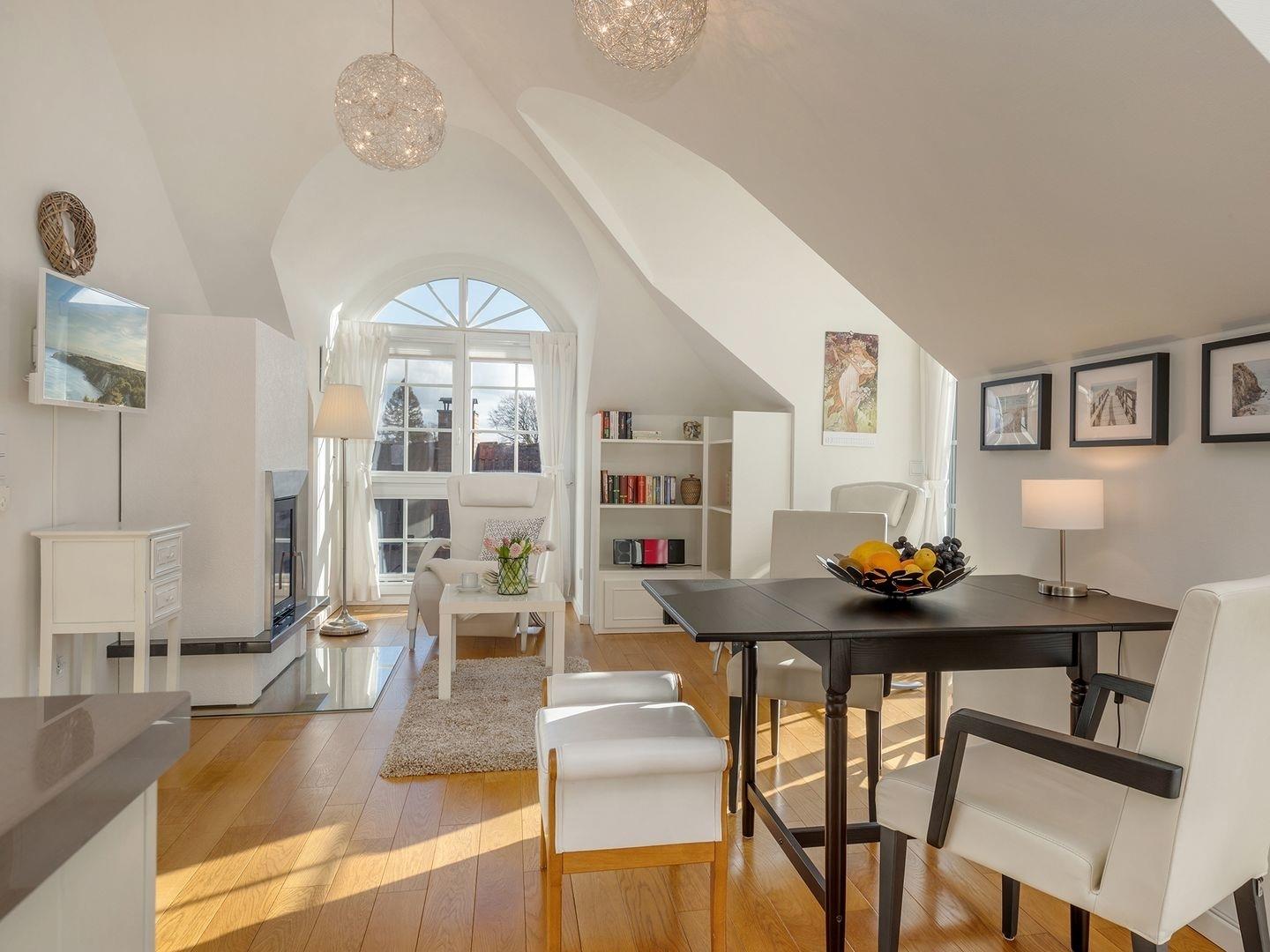 Die Ferienwohnung verfügt über einen gemütlichen Wohn-Essbereich mit Kamin.Eine voll ausgestattete hochwertige Küche, sogar mit Dampfgarer und Tellerwärmer, lädt zum schönen Kochen zu zweit ein. In den beiden Relax-Sesseln lässt sich ein entspannter Fernsehabend verleben. Die zwei angrenzenden Balkone laden mit seitlichem Ostseeblick zu einem entspannten Frühstück oder einem Glas Wein am Abend ein.