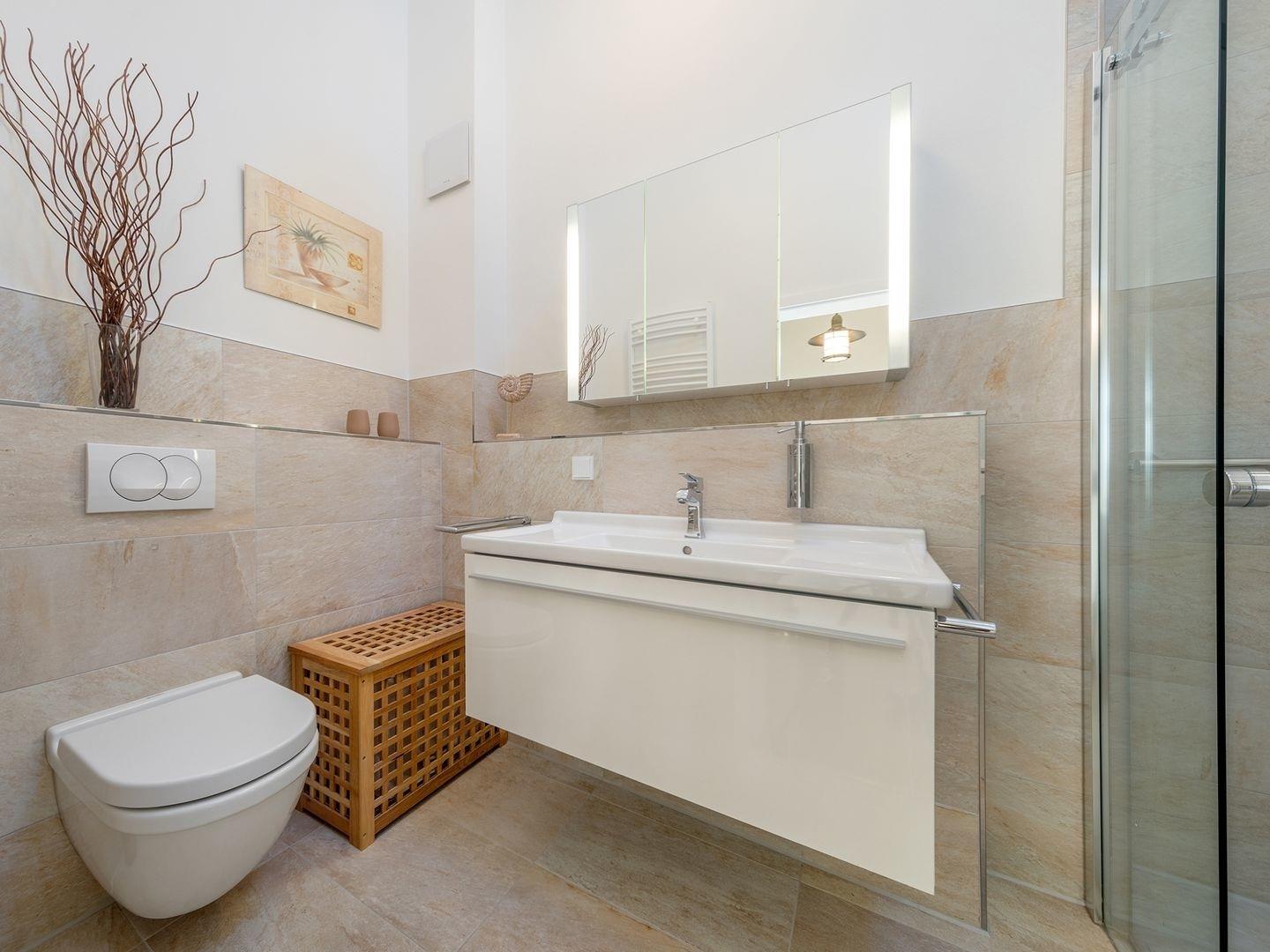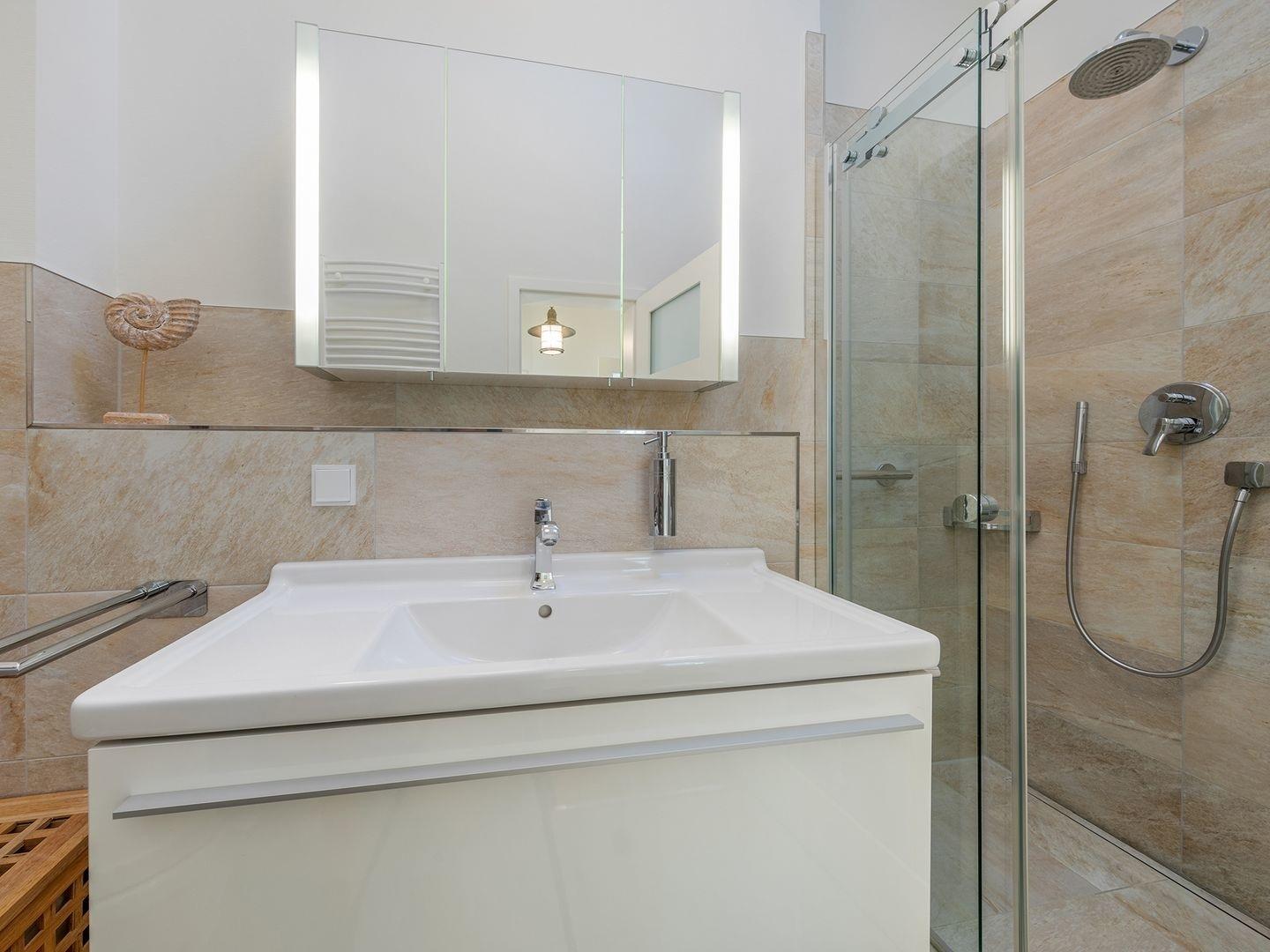 Das Badezimmer hat eine ebenerdige Dusche und verfügt über Dachfenster welches das Badezimmer mit Tageslicht flutet. Zusätzliche steht Ihnen eine Waschmaschine (gegen Gebühr) zur Verfügung.