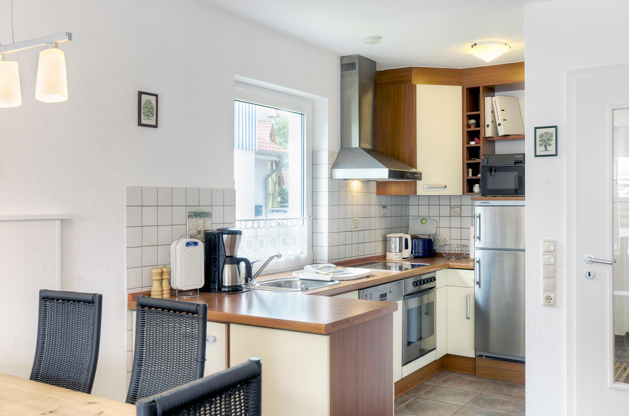 Die toll ausgestattete Küche bietet nicht nur einen Kühlschrank und Ofen, sondern auch eine Mikrowelle und Kaffeemaschine!