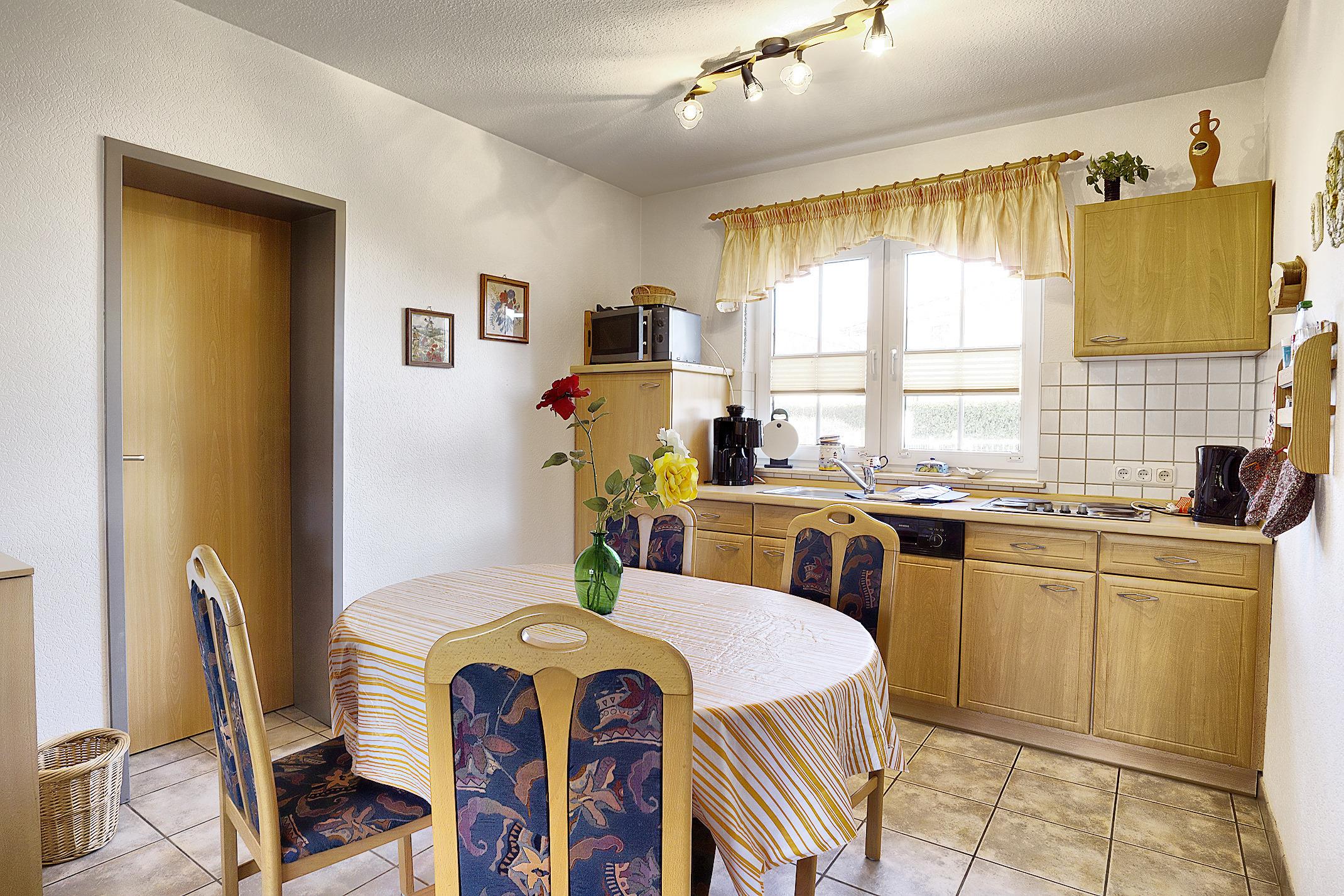 Die gut ausgestattete Küche besitzt unter anderem einen Kühlschrank, einen Herd zum Kochen und sogar eine Spülmaschine.