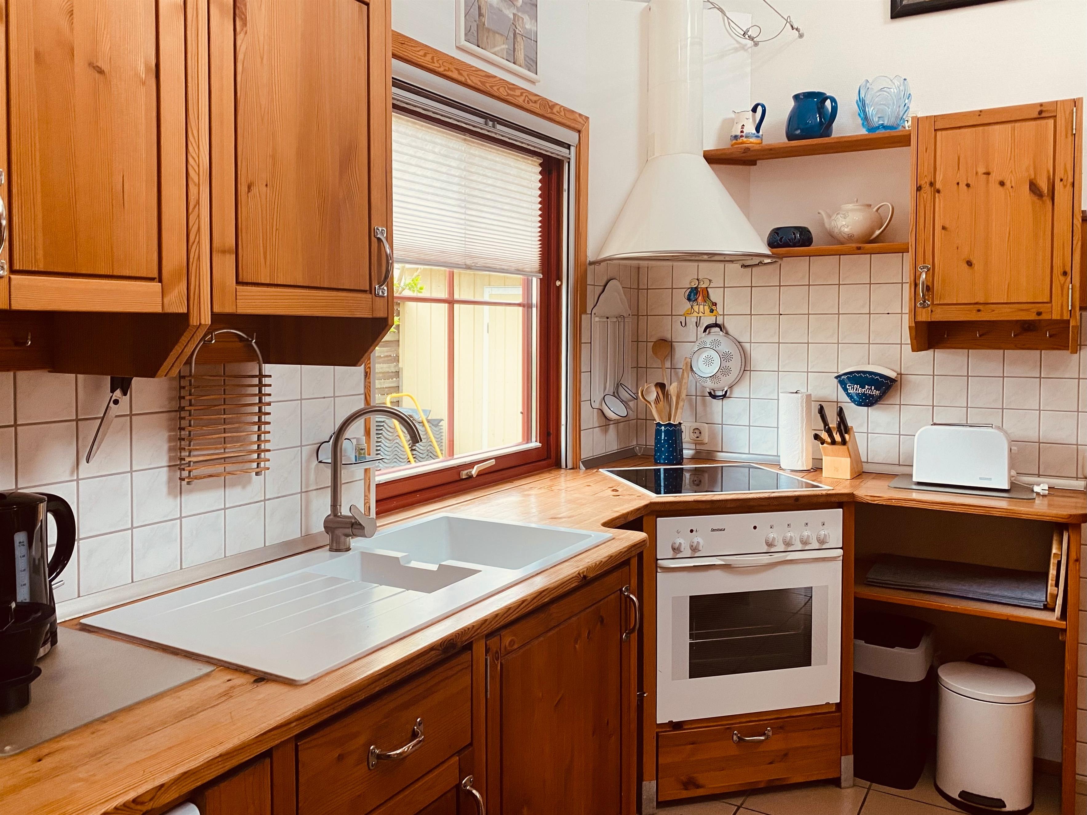 Die gut ausgestattete Küche besitzt unter anderem einen Kühlschrank, einen Herd zum Kochen und sogar eine Spülmaschine.