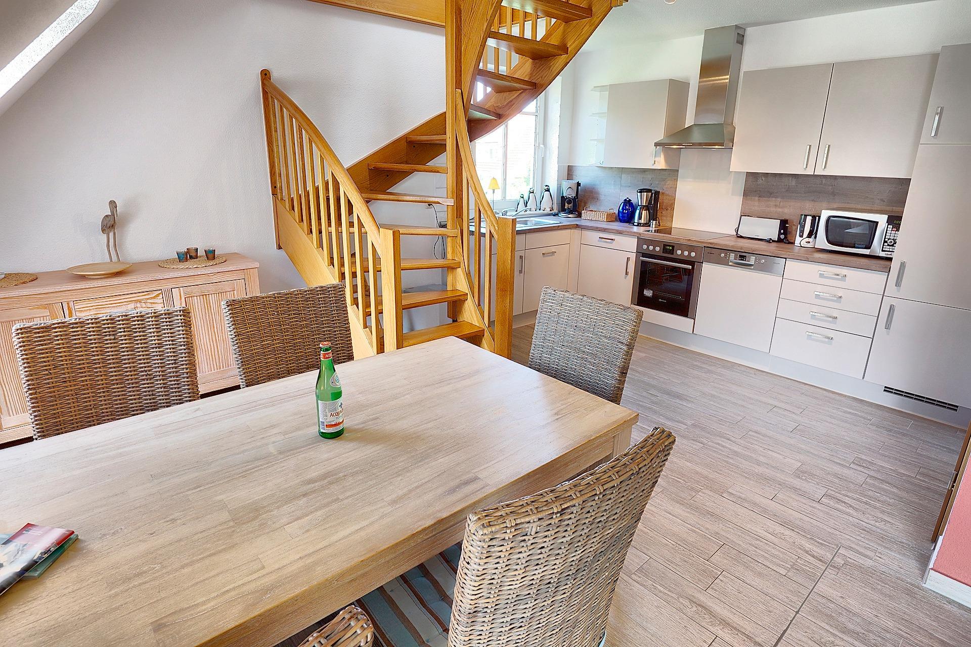 Die gut ausgestattete Küche besitzt unter anderem einen Kühlschrank, einen Herd zum Kochen und sogar eine Spülmaschine.