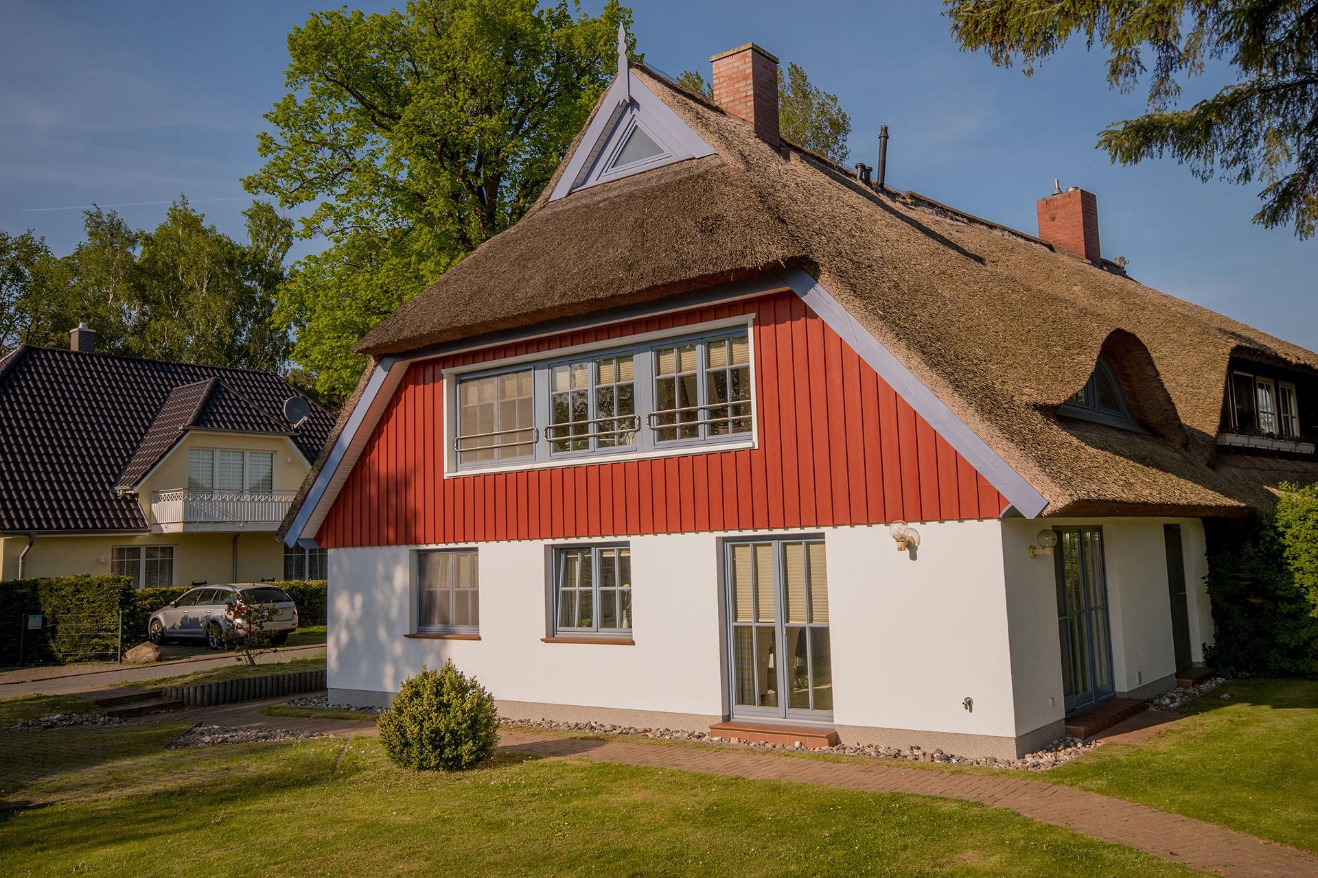 FeWo in einer neugebauten Doppelhaushälfte unter Reetdach, hochwertige Ausstattung mit kompl. Küchenzeile mit Ceranfeld, Mikrowelle, Geschirrspüler etc., SAT-TV, CD Player, Fußbodenheizung, 1 Schlafzimmer mit Ehebetten, 1 Schlafzimmer mit EinzelbettenDusche/WC, Waschtrockner, Gemeinschaftsgartenanlage mit Grillecke und Elektrogrill, Gartenhaus, Kinderspielgeräte, Liegewiese etc.