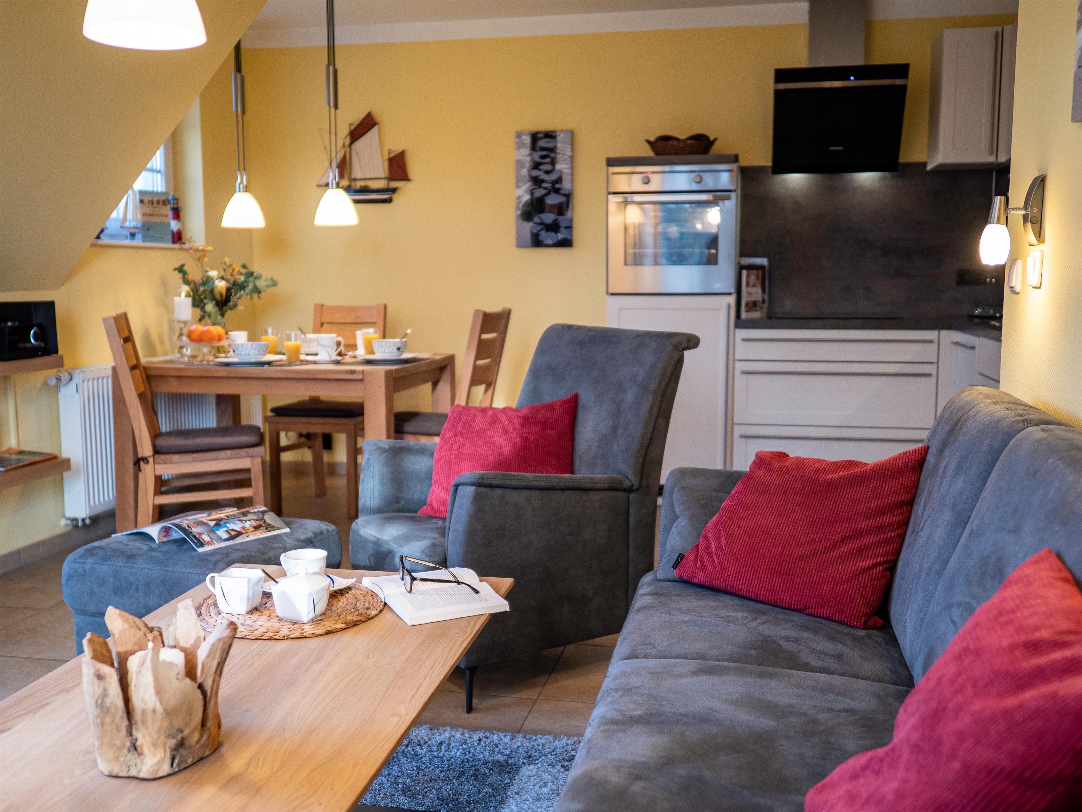 Sie bietet für 2Personen ein gemütliches Ambiente und ist liebevoll und hochwertig eingerichtet. Im Wohnzimmer sorgt ein 55"- Flachbildschirm für Fernseh-Vergnügen, das Schlafzimmer verwöhnt Sie mit einem 50"- Flachbildschirm. Ein Kaminofen im Wohnzimmer sorgt für behagliche Wärme an kalten Tagen. Das exklusive Bad ist mit einer Fußbodenheizung ausgestattet. Die Wohnung besitzt 2 große Balkone ( Süd - und Westlage ) mit Blick ins Grüne. Beide Balkone sind mit bequemen, verstellbaren Klappstühlen mit Liegefunktion, Fußhocker, Tisch und Sonnenschirm ausgestattet. Ebenfalls zur Wohnung gehört ein eigener Abstellraum für Fahrräder und Strandutensilien. Kostenloser WLAN-Anschluß.