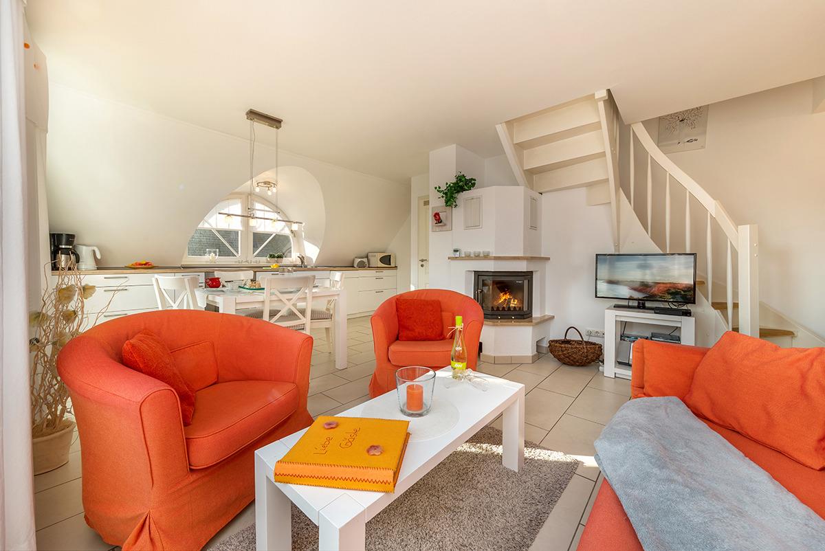 Schöne 51qm Komfortwohnung in Strandnähe (ca. 2 min Fußweg) die höchsten Ansprüchen gerecht wird. In ruhiger Lage mit 2 Parkplätzen am Haus und einem separatem Eingang genießt man hier in idyllischer Landschaft seinen Luxusurlaub. Die Wohnung befindet sich im 1.OG des Hauses. Besondere Merkmale wie ein offener Kamin im Wohnzimmer, Bad mit Dusche und WC sowie ein Gäste WC (beides in Mamor) sorgen für ein rundrum wohliges Wohnen. Die Küche ist voll ausgestattet, Waschmaschine und Trockner sind ebenfalls g.G. zu benutzen.Die Gemeinschaftssauna kann ebenfalls jederzeit gerne benutzt werden.