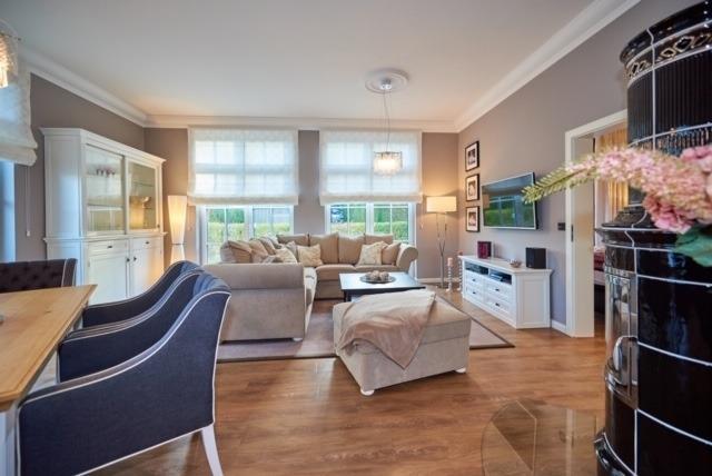 Die ebenerdig liegende ca 84 qm große Ferienwohnung "Sehnsucht Victoria Luna 2" mit Ost/Südterrasse verfügt über ein geräumiges und gemütlich eingerichtetes Wohnzimmer mit Küchen- Essbereich sowie einem Kamin.